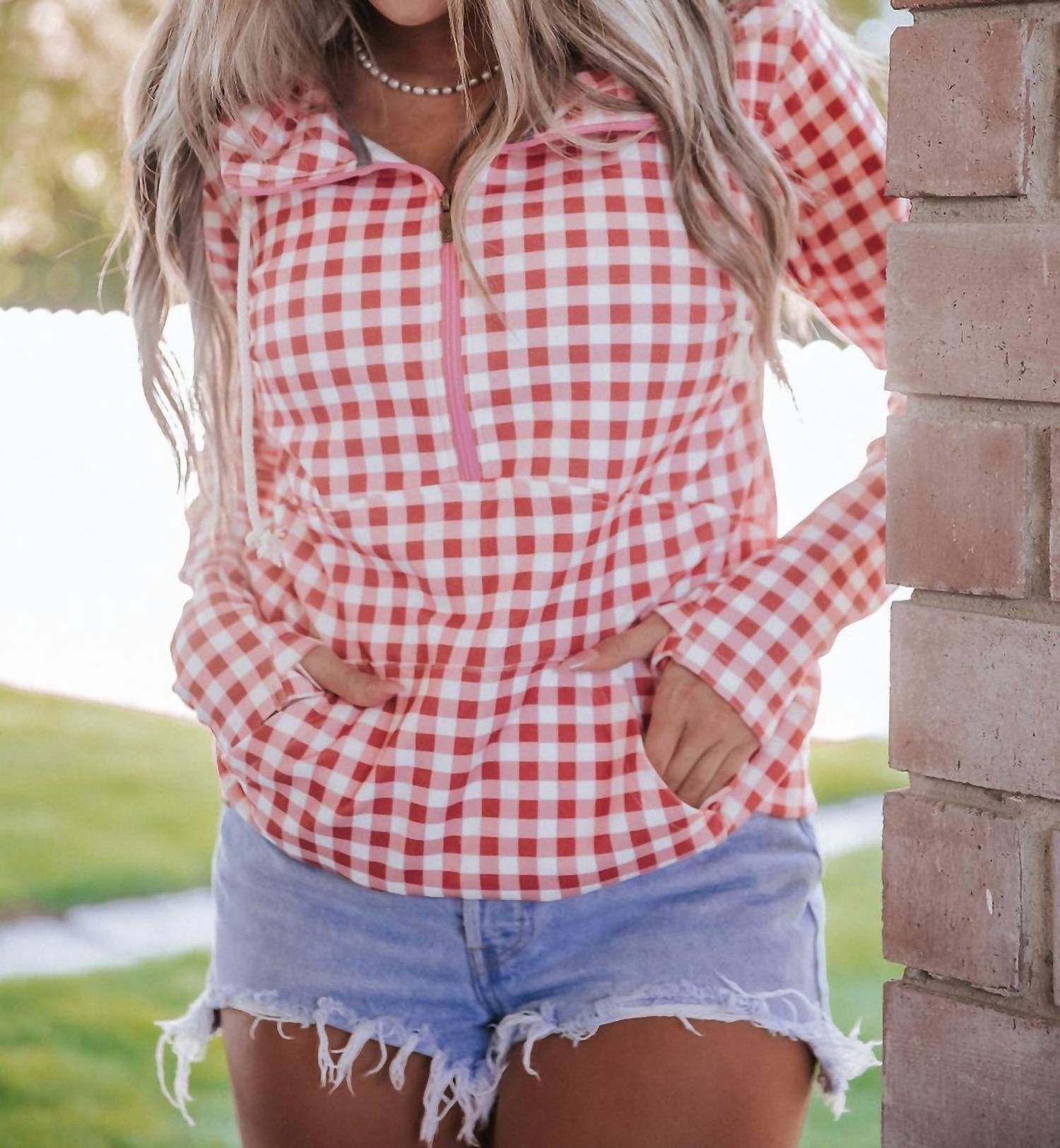 Whether you're running around town or lounging at home, this sweatshirt works for both. Discover casual comfort with the Youth Halfzip Sweatshirt by Ampersand Ave, a must-have for fall fashion in a vibrant Picnic plaid and check pattern. This women's sweatshirt is crafted from a cozy cotton blend with long sleeves and a convenient hooded neckline, making it perfect for back-to-school outings. Featuring a practical zip closure and handy pockets, it's both stylish and functional. Ideal for Thanksgiving and 90s fashion enthusiasts.