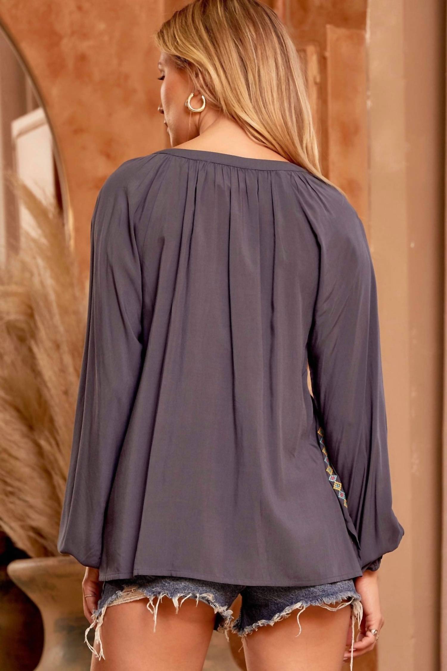 A versatile blouse that works from desk to dinner! Introducing the Embroidered Lace Blouse by Andree by Unit in a captivating Midnight hue, ideal for your next holiday party. This stylish blouse boasts vibrant embroidery and long balloon sleeves with elastic cuffs, complemented by lace detailing and a flattering A-line silhouette. Made from 100% woven Rayon, it ensures comfort and elegance without stretch. Enjoy the convenience of its pull-on closure and maintain with hand wash care. Available in multiple sizes, such as Small (Bust 38", Length 26") and 3X (Bust 52", Length 29").
