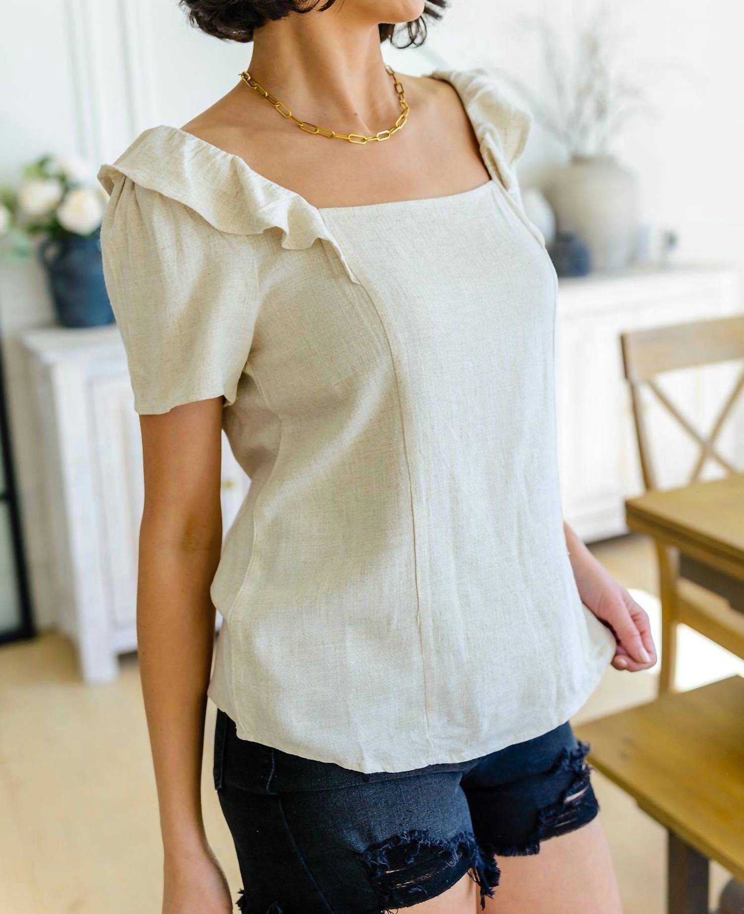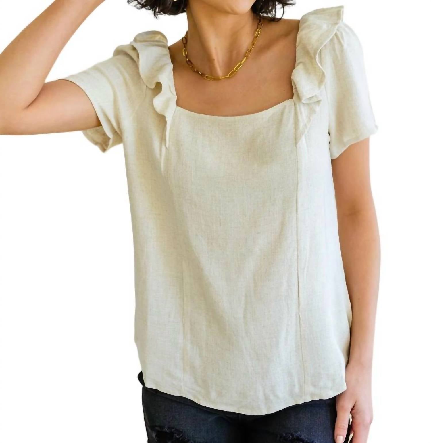 Square neckline and ruffle detail at the shoulders. Lightweight Woven. Non-Stretchy. 70% Viscose, 30% Linen. True to Size.
