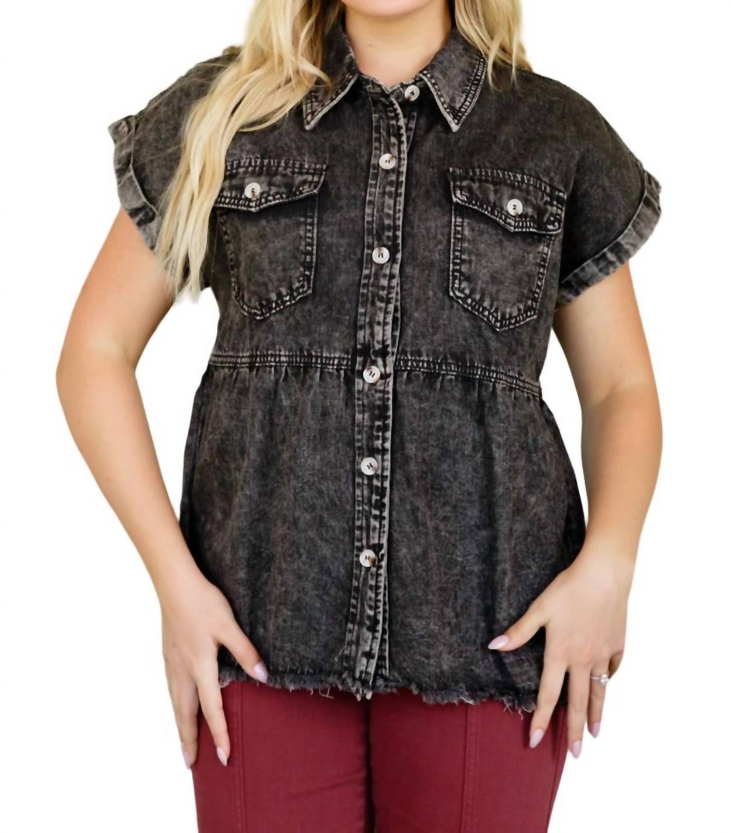 Lightweight Denim. Mineral Washed. Collared Neckline. Cuffed Dolman Sleeves. Button Front Closure. Patch Pockets with Decorative Button Flaps. Babydoll Silhouette. Frayed Hem. 90% Cotton, 10% Polyester. True to Size.