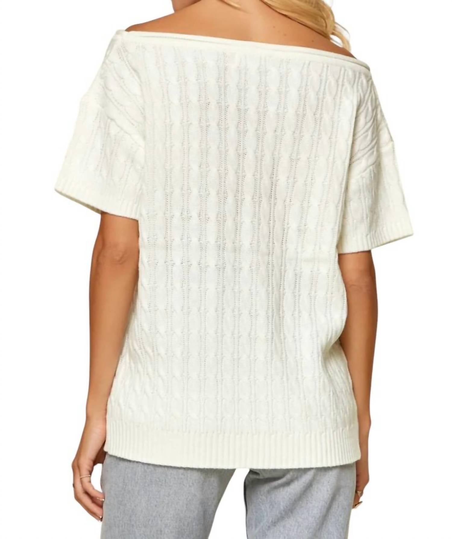 This cable knit sweater top features dolman sleeves, a short sleeve design, and can be worn off one shoulder. Made from 100% acrylic and designed as a pull-on style.