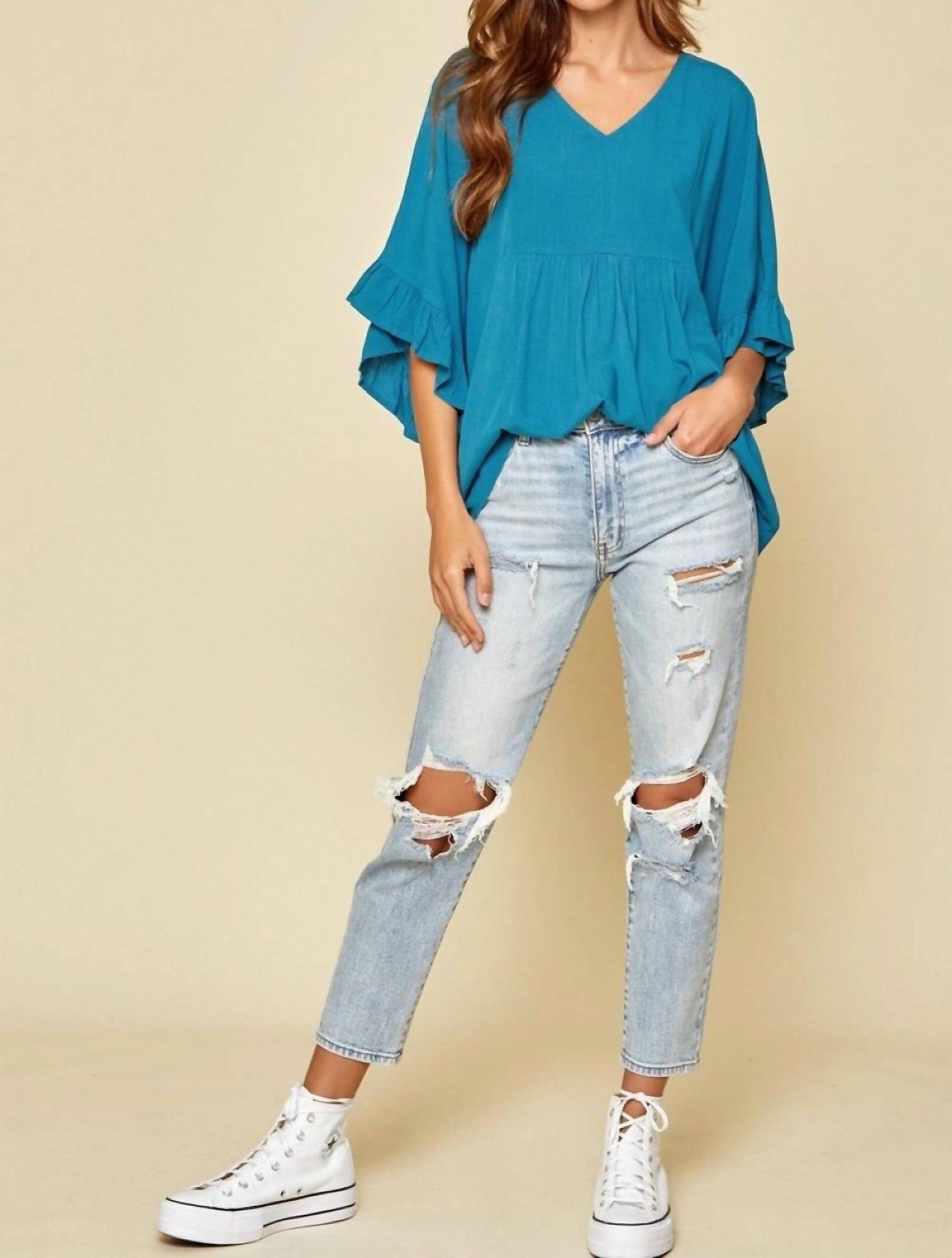A timeless blouse that will never go out of style. Introducing the Ruffle Sleeve Top by Andree By Unit, a chic addition to your wardrobe in a stunning teal color. This blouse showcases long dolman ruffle sleeves with a flattering V-neckline and a flowy, oversized bodice. Composed of 100% Rayon for a soft touch. Care is simple with hand wash cold instructions to maintain its pristine condition.