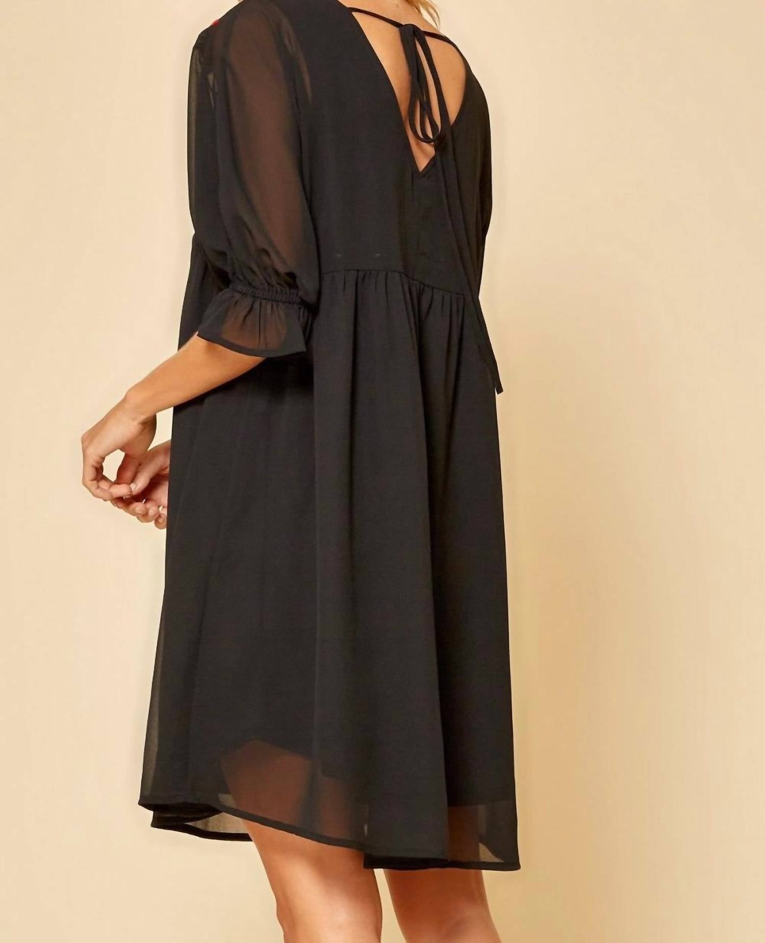 The kind of easy and flattering dress you'll be reaching for all season long. Introducing the Floral Embroidered Dress by ANDREE BY UNIT, a captivating black mini dress perfect for any occasion. This boho chic garment features elegant elbow-length sleeves with ruffles and no pockets. Made from 100% woven polyester, the dress boasts a high waist, V-neckline, and A-line silhouette with a floral pattern. Closure is pull-on, and for optimal care, hand wash cold. Available dimensions: Small Bust 38", Medium Bust 40", Large Bust 42" with a consistent length of 36".