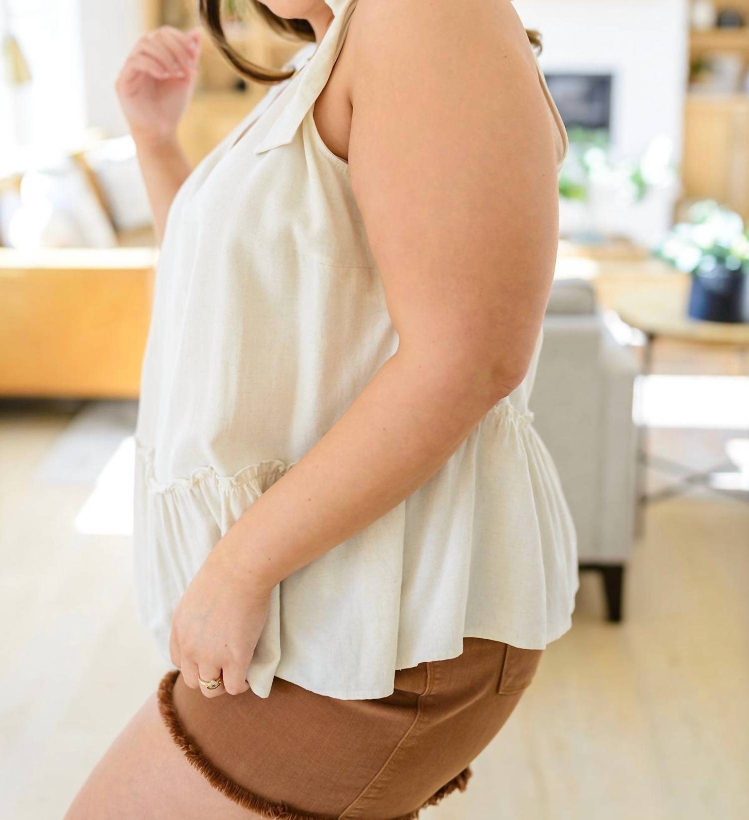 V-neck front and back. Woven Rayon. Ruffled Peplum. Functional Ties at Shoulders. 100% Rayon. True to Size.
