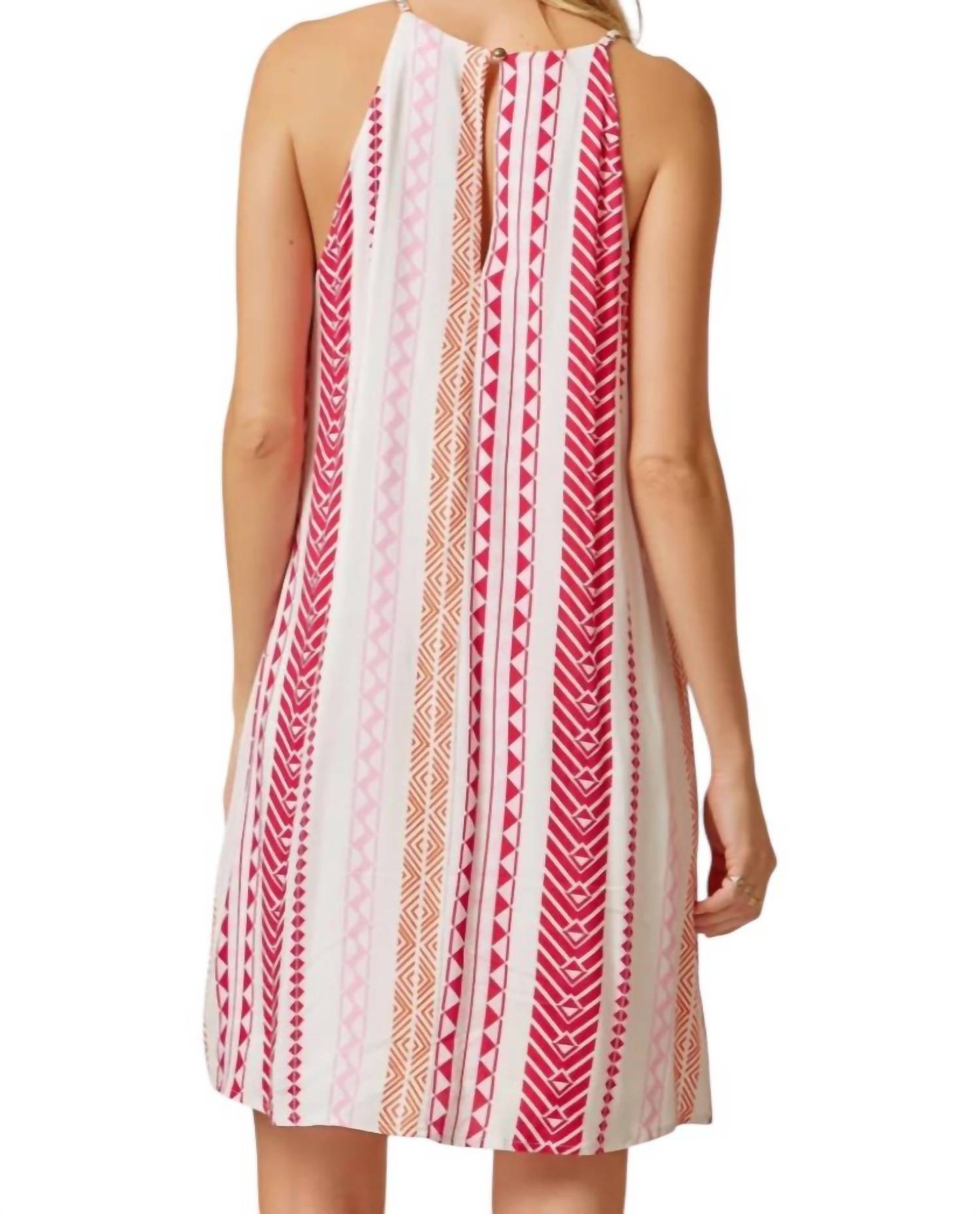 This mini dress features a geometric print, adjustable straps, and details on the back with a button closure. It is made from 100% rayon.