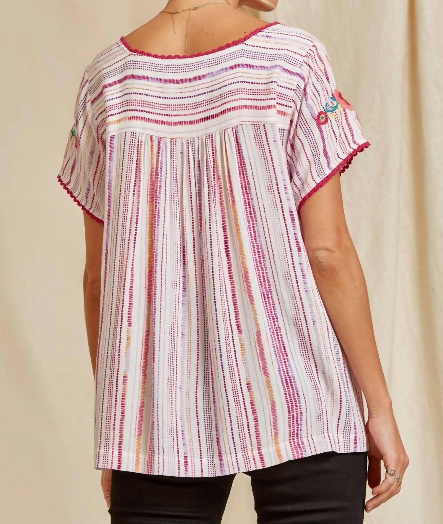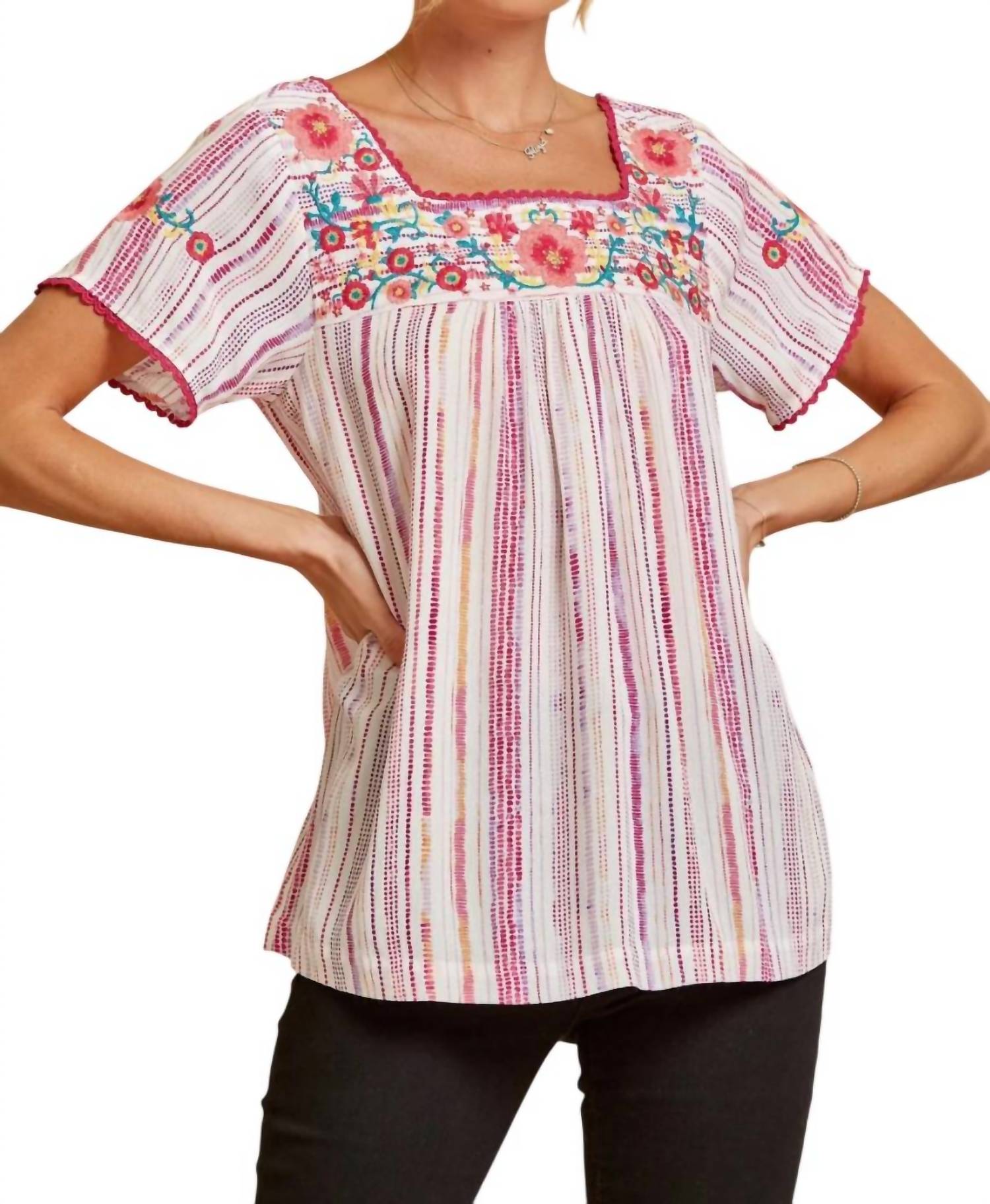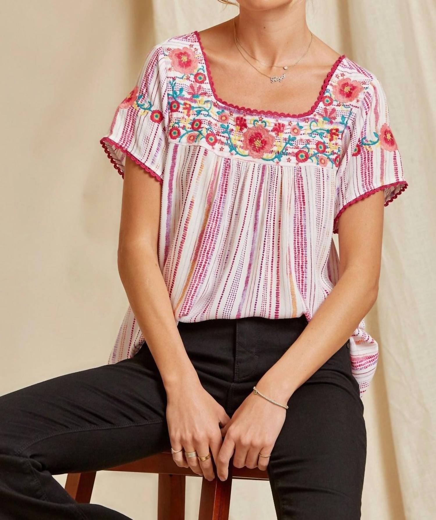 Square neckline, short sleeves, crochet detailing, colorful floral embroidery, striped woven fabric, and a relaxed A-line fit. Small: Bust 38", Length 25". Medium: Bust 40", Length 25". Large: Bust 42", Length 25". 1X: Bust 46", Length 26". 2X: Bust 48", Length 26". 3X: Bust 50", Length 26". 100% rayon with no stretch. Hand wash cold.