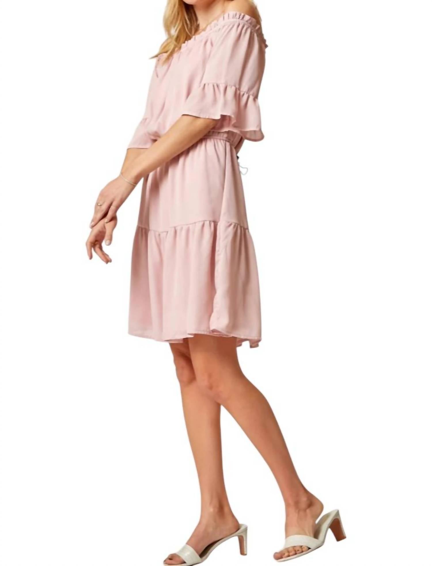 This mini dress features an off-the-shoulder design, a tiered bodice, and elastic on the shoulder seam. It has half bell sleeves, is lined, and made from 100% polyester.