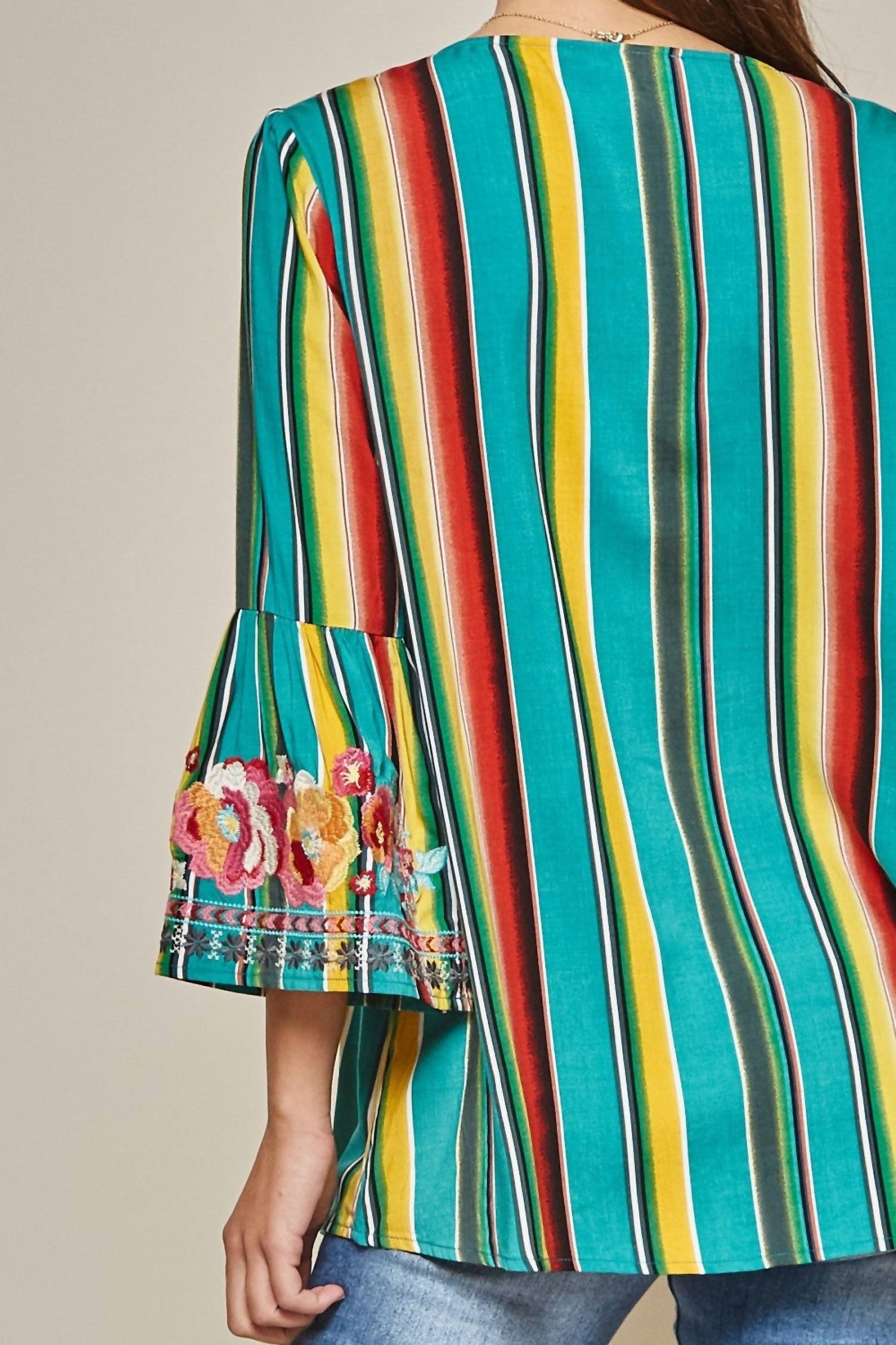 A perfect addition to any wardrobe, this classic tunic style blouse is flattering and effortless. You can easily transition from desk to dinner in this chic top. Introducing the South Beach Striped Embroidered Top by ANDREE BY UNIT, perfect for a boho chic summer look. This relaxed tunic features three-quarter bell sleeves, a split V-neckline, and colorful embroidery, designed to offer a tailored yet comfortable fit. Made from 100% woven rayon with no stretch, this turquoise top offers a textured style. With a pull-on closure, it's easy to wear, and care instructions suggest hand washing cold to maintain its vibrant appeal.