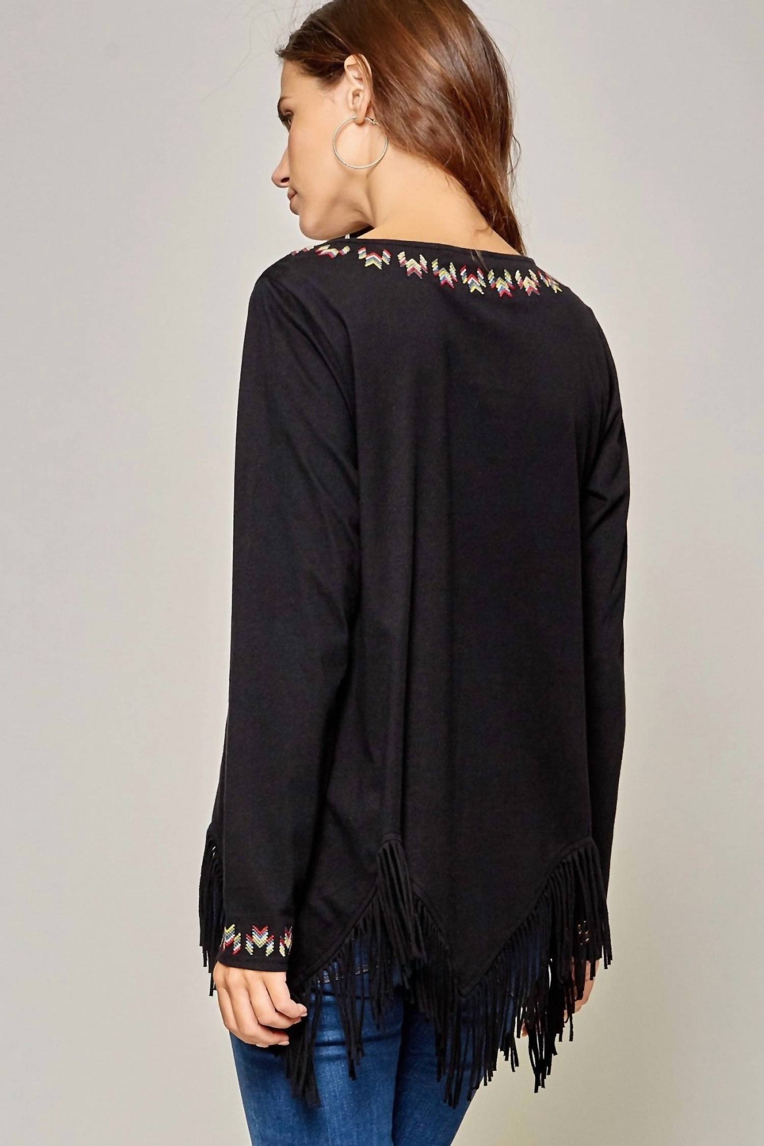 Embrace the versatility of this tunic-style blouse, expertly crafted for seamless layering or perfect to wear on its own. Its detailed design and comfortable fit make it a perfect addition to any closet. Elevate your boho chic wardrobe with the Geo Embroidered Fringe Top by ANDREE BY UNIT. This tunic showcases long sleeves, vibrant multicolored embroidery, and a fun zig zag fringe hemline for a lively silhouette. Made from 100% cotton with some stretch, it offers a relaxed A-line fit. Dimensions include a bust of 36" for small, 38" for medium, and 40" for large, with a length of approximately 26" - 31" including the fringe. Closure: Pull-on style. Care: Hand wash cold. Ideal for a beach day or paired with skinny jeans and booties for a city outing.