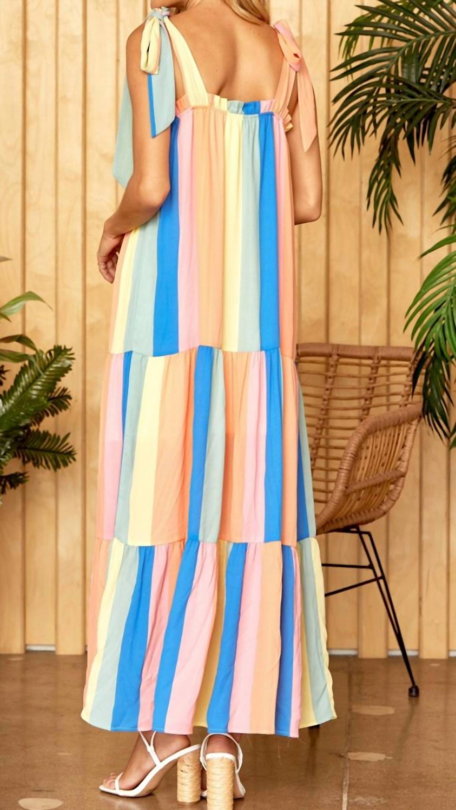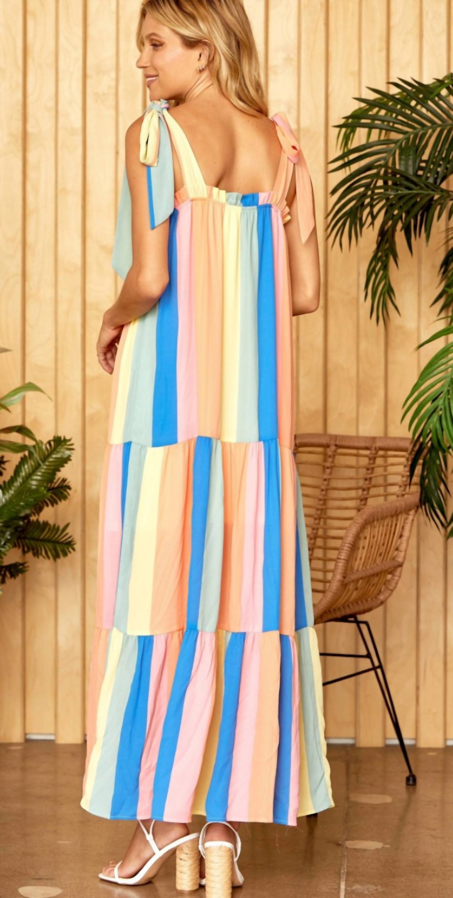 Style this maxi with your favorite statement necklace and sandals for the perfect look. This dreamy, boho-inspired maxi dress features a flowy, tiered silhouette with vertical pastel stripes in shades of blue, peach, yellow, and pink. The adjustable bow-tie shoulder straps add a delicate, feminine touch, while the relaxed fit ensures effortless comfort. Perfect for warm weather, vacations, or summer gatherings, this dress pairs beautifully with sandals or wedges for a light and airy look.