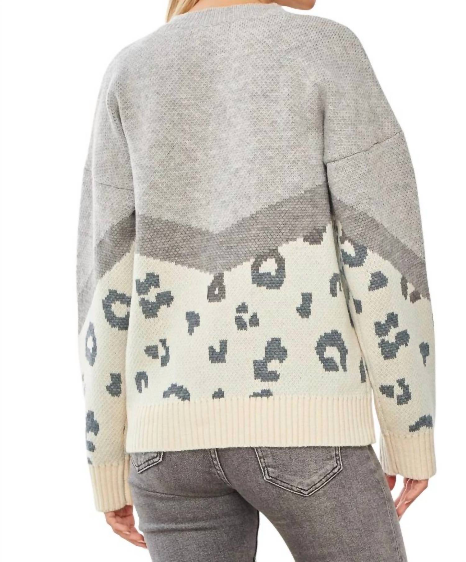 This sweater features a leopard and colorblock design with long sleeves. It is a pull-on style made from 100% acrylic. Handwash and hang to dry.