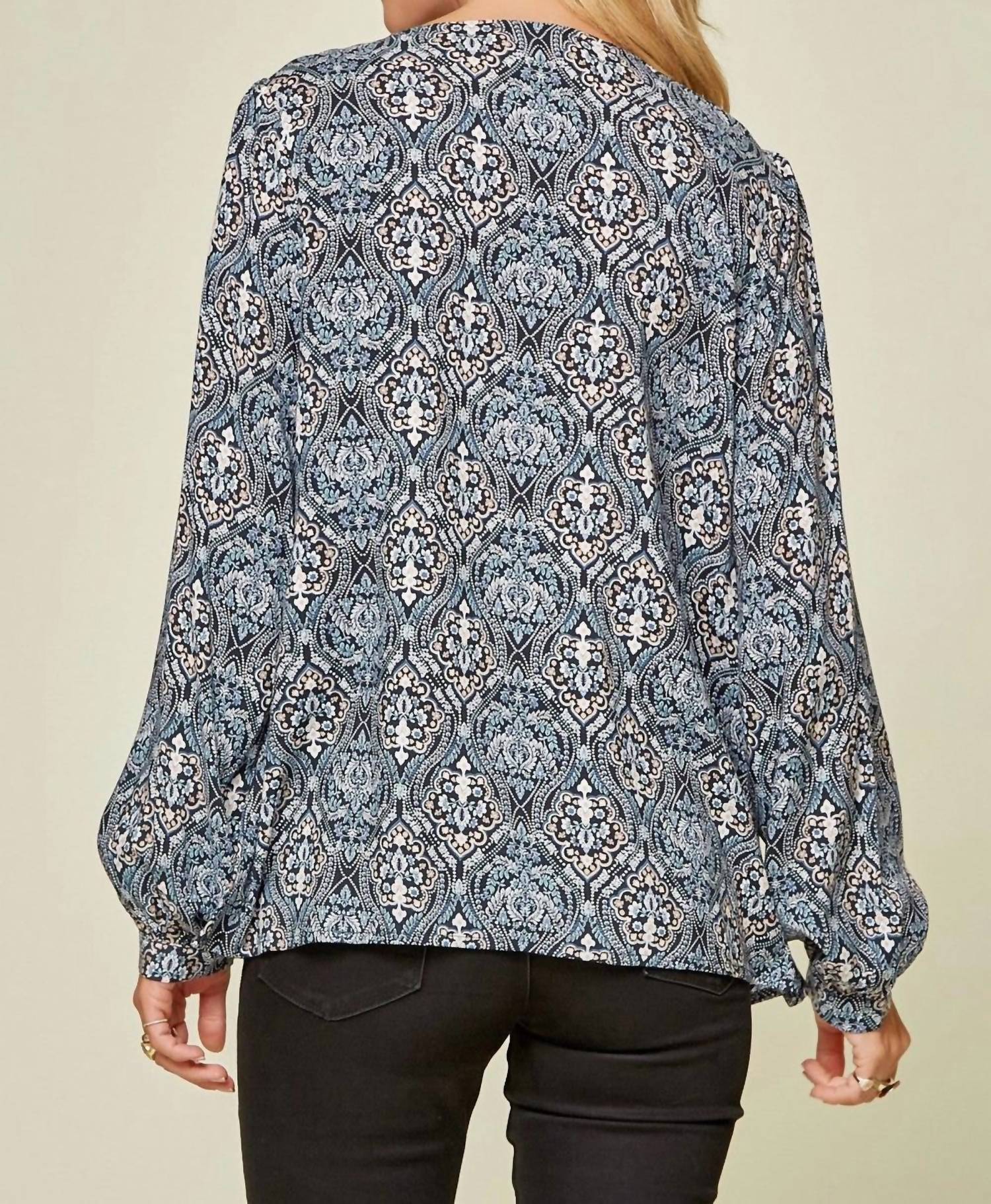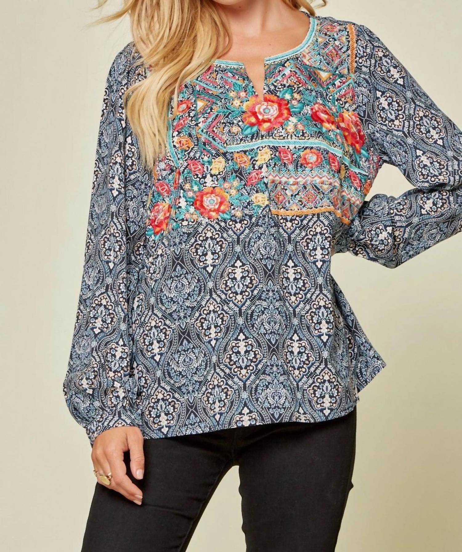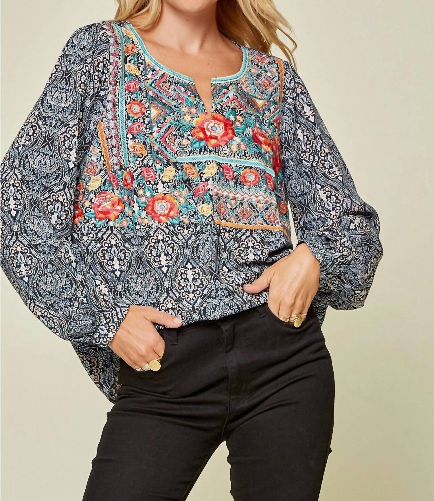 Split V-neckline top with colorful floral embroidery on a printed fabric, long sleeves, and a relaxed A-line fit. Lightweight. 100% woven rayon, no stretch. Hand wash cold. Small: Bust 38", Length 26". Medium: Bust 40", Length 26". Large: Bust 42", Length 26". 1X: Bust 50", Length 28". 2X: Bust 52", Length 28". 3X: Bust 54", Length 28".