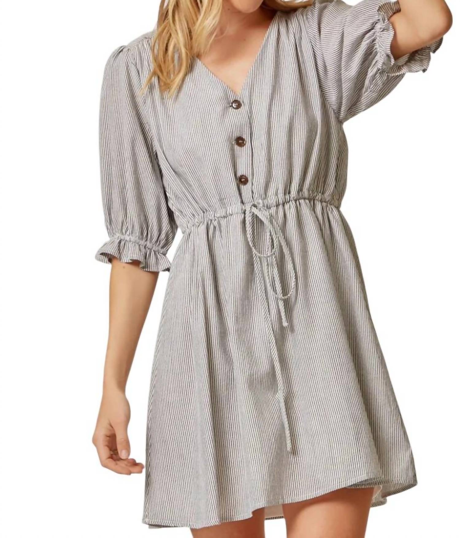 This casual dress features a button-down front, a tunnel waistline, short puff sleeves, and a flared bodice. It has a V-neckline and is lined, made from 100% cotton.