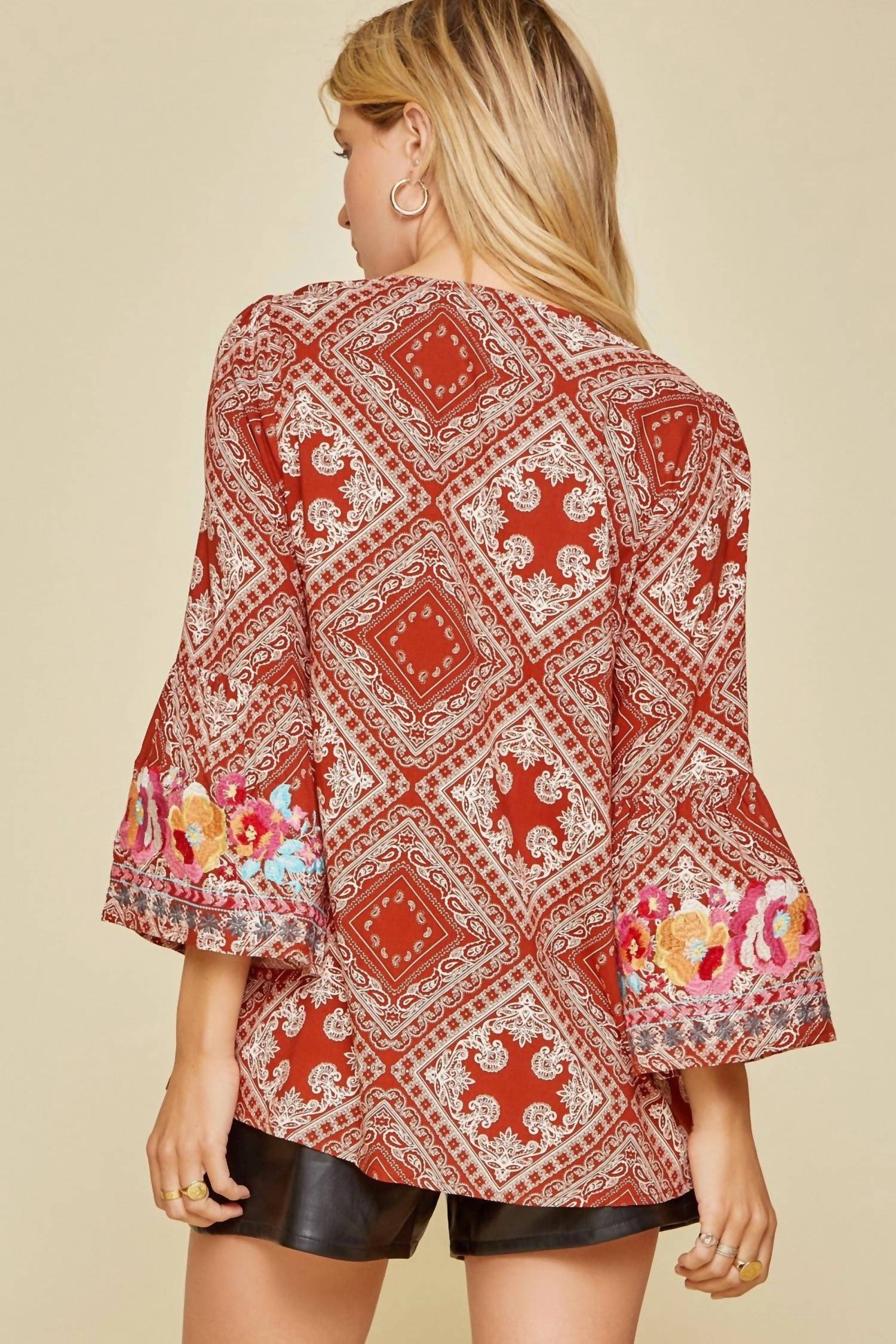 A versatile blouse that works from desk to dinner! Embrace boho chic style with the South Beach Embroidered Bandana Top by Andree by Unit in rust. This eye-catching blouse is made from 100% woven rayon, featuring colorful embroidery and a split V-neckline. The long bell sleeves and relaxed A-line fit with a flowy bodice offer a comfortable yet stylish look. Care: Hand wash cold. Closure: Pull on.