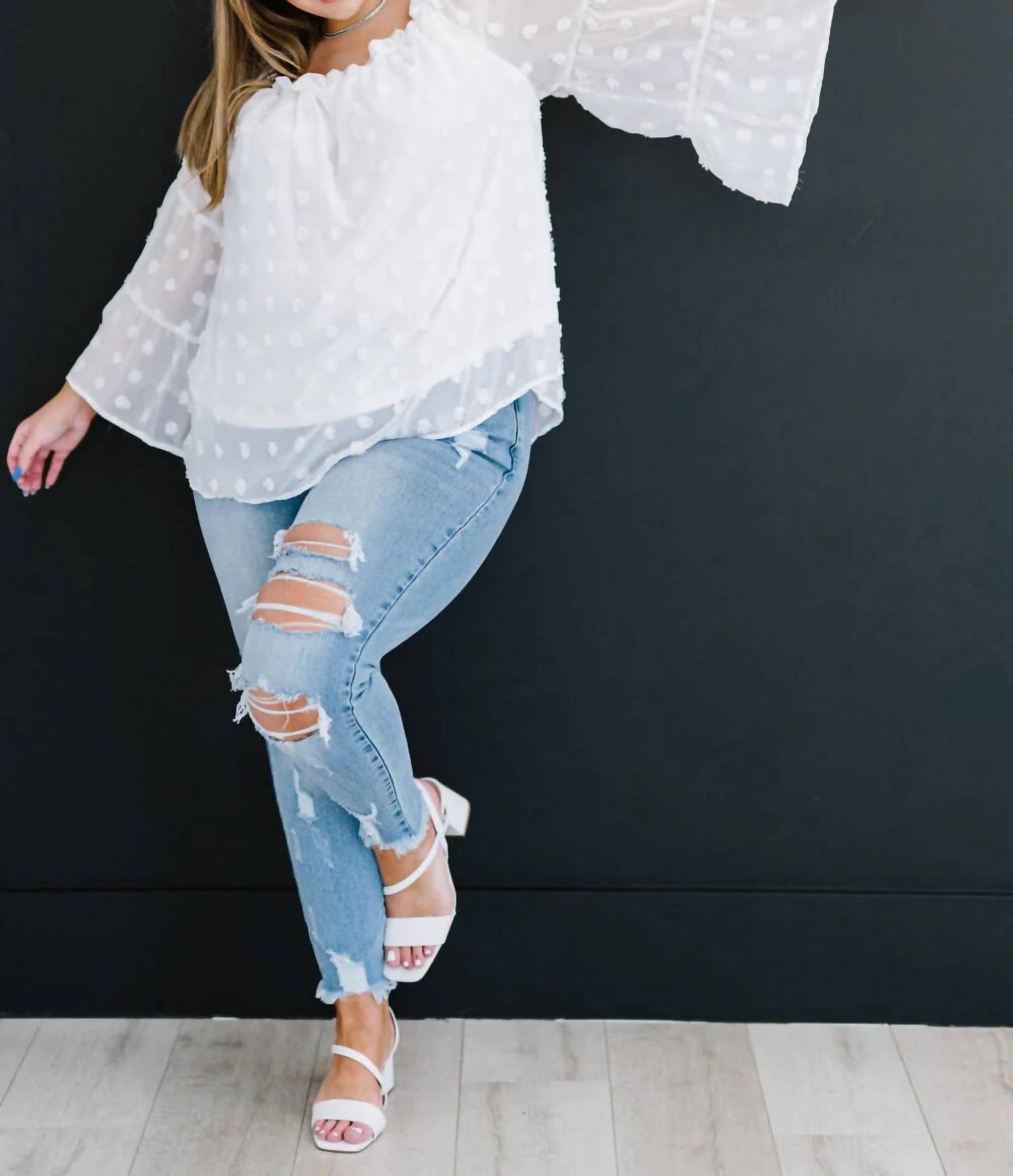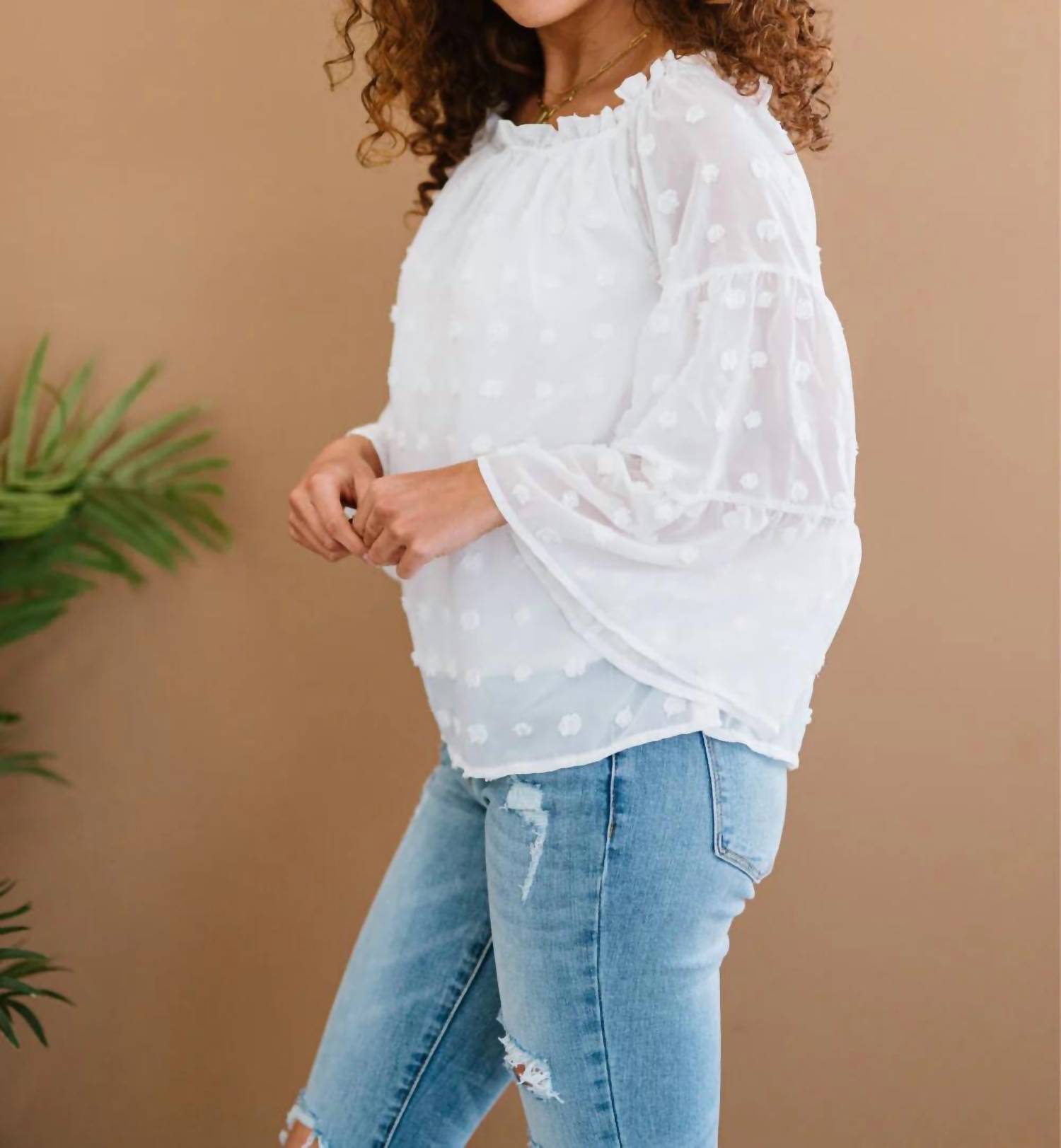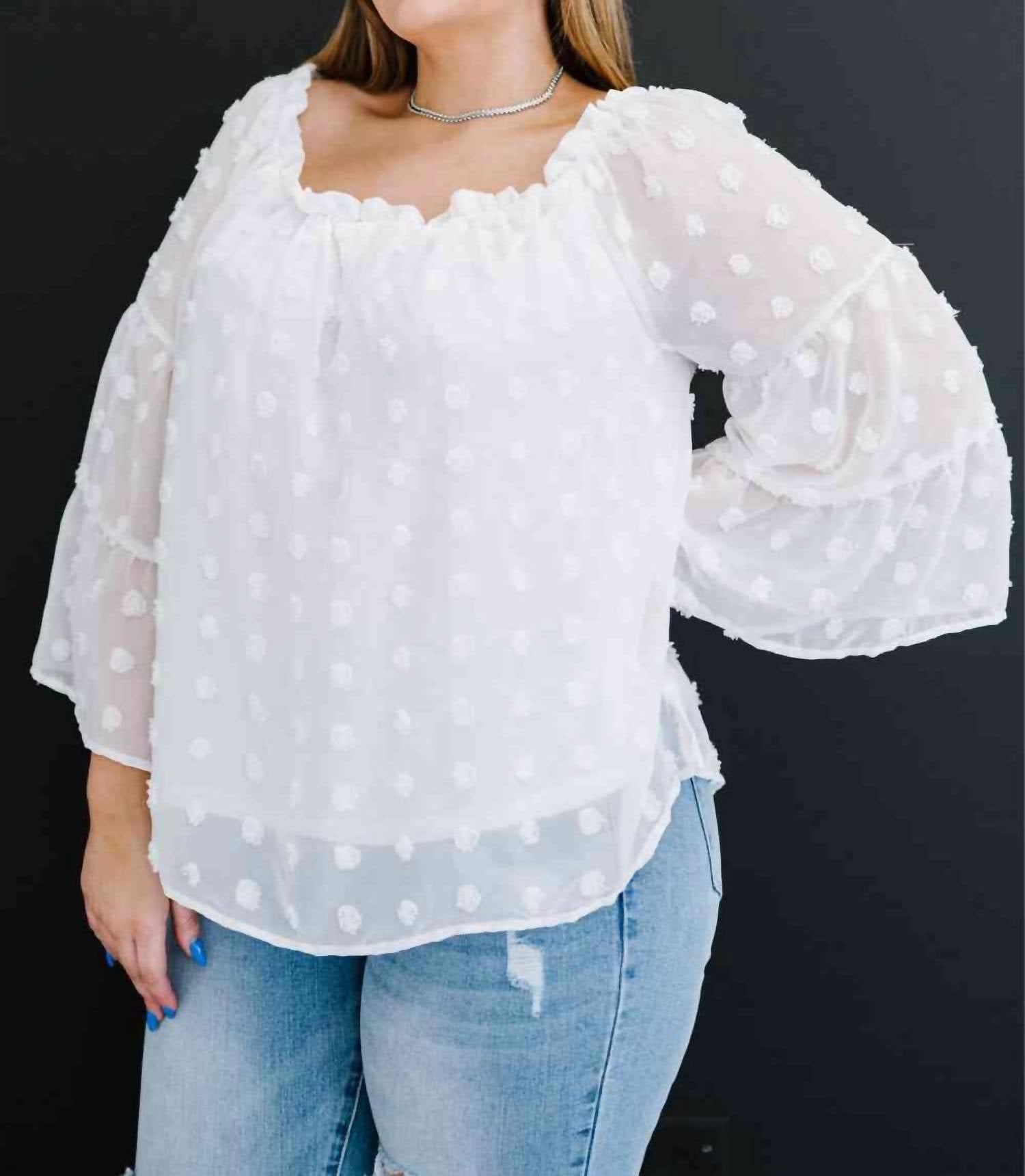 A timeless blouse that will never go out of style. Introducing the Daydreamer Full Size Run Pom-pom Blouse by ANDREE BY UNIT, a captivating piece in elegant white for a chic, daydream-worthy look. This long sleeve blouse highlights beautiful sheer bell sleeves and an off-the-shoulder neckline, adorned with delicate pom-pom details. Crafted from 100% polyester, it features a frill trim and is partially sheer with a lined bodice for comfort. Closure: Pull on. Care: Hand wash cold. This imported blouse offers sizes S to 3X with bust measurements ranging from 38 to 55 inches and lengths from 21 to 26.5 inches.