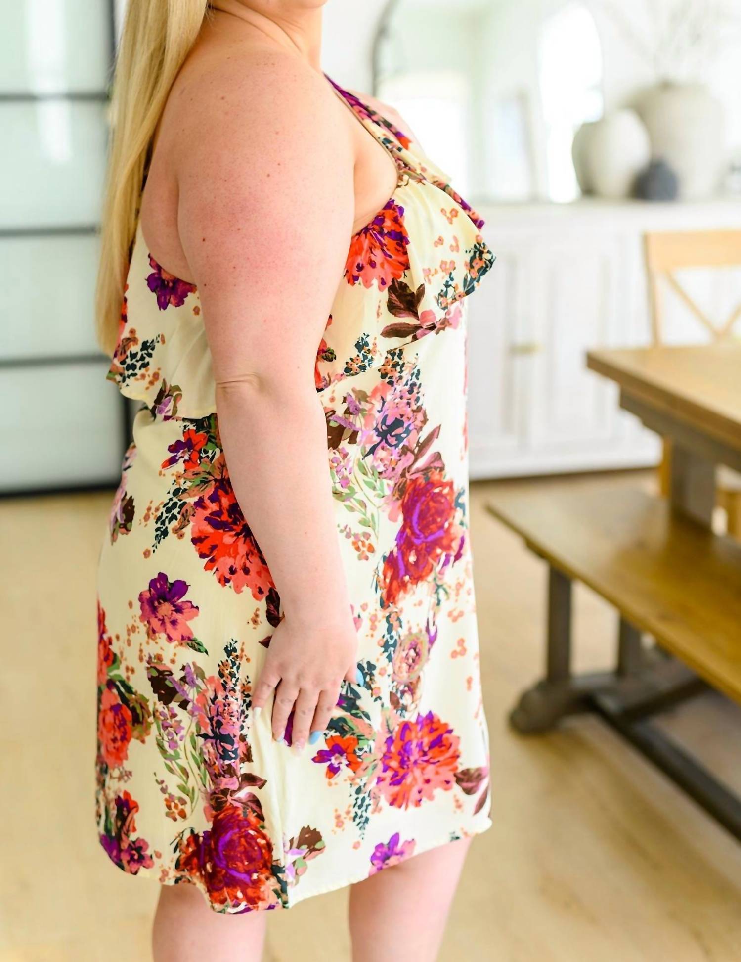 Woven Fabric. Cased Elastic Neckline. Single Shoulder Cut. Shift Silhouette. Fully Lined. Self: 100% Rayon, Lining: 100% Polyester. True to Size.