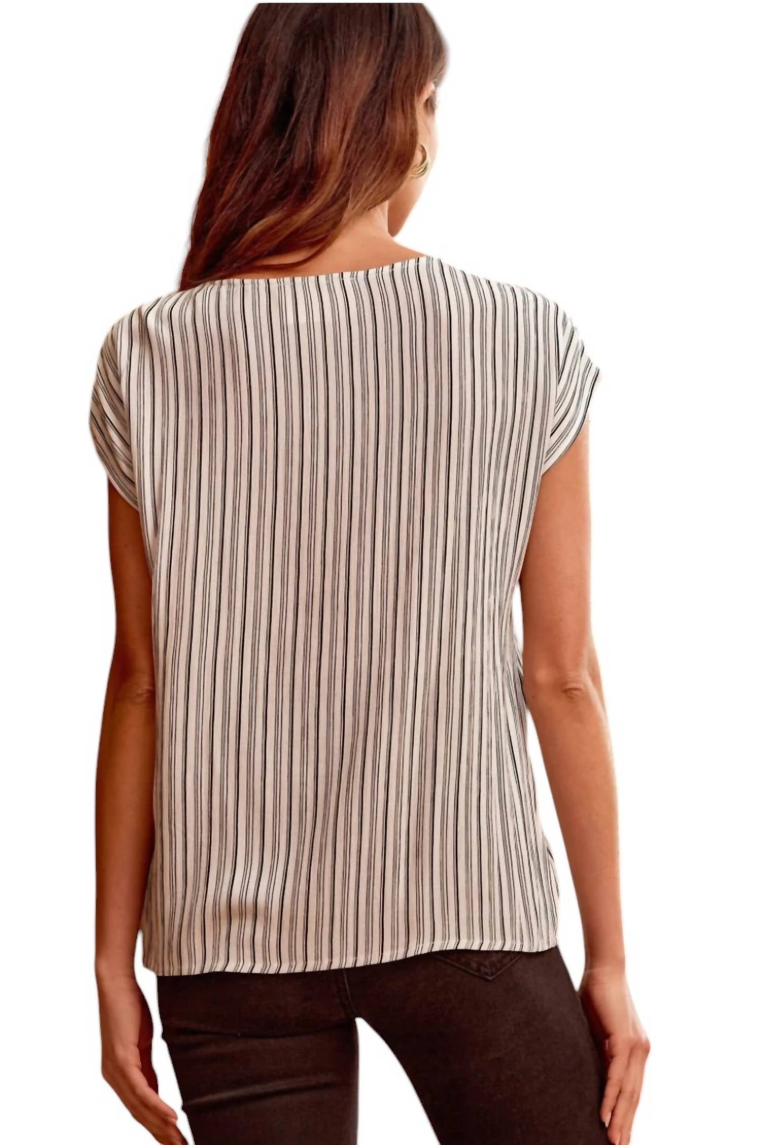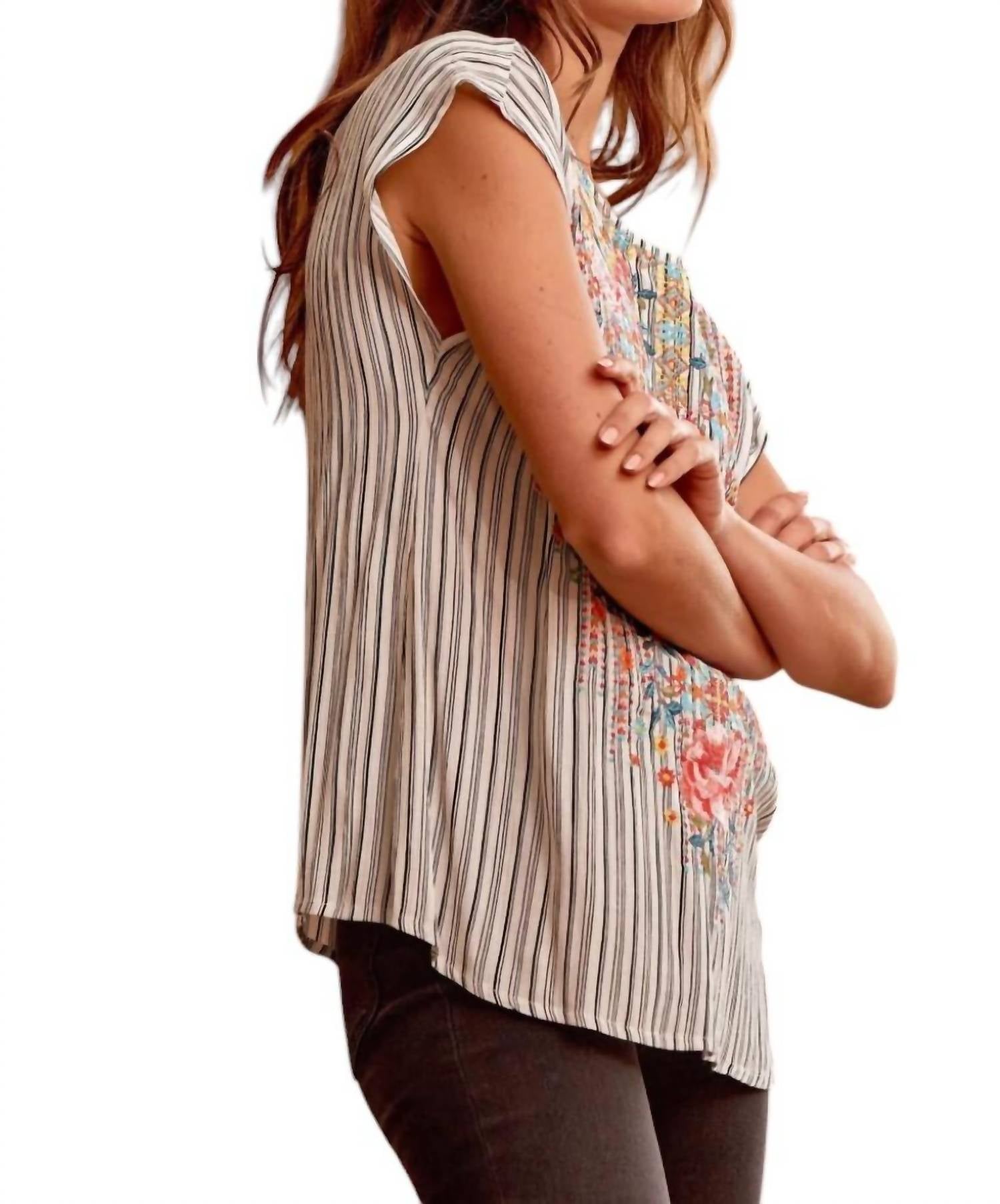 This striped top features a round neckline, short sleeves, and a floral embroidered design all over the front. Made from 100% rayon.