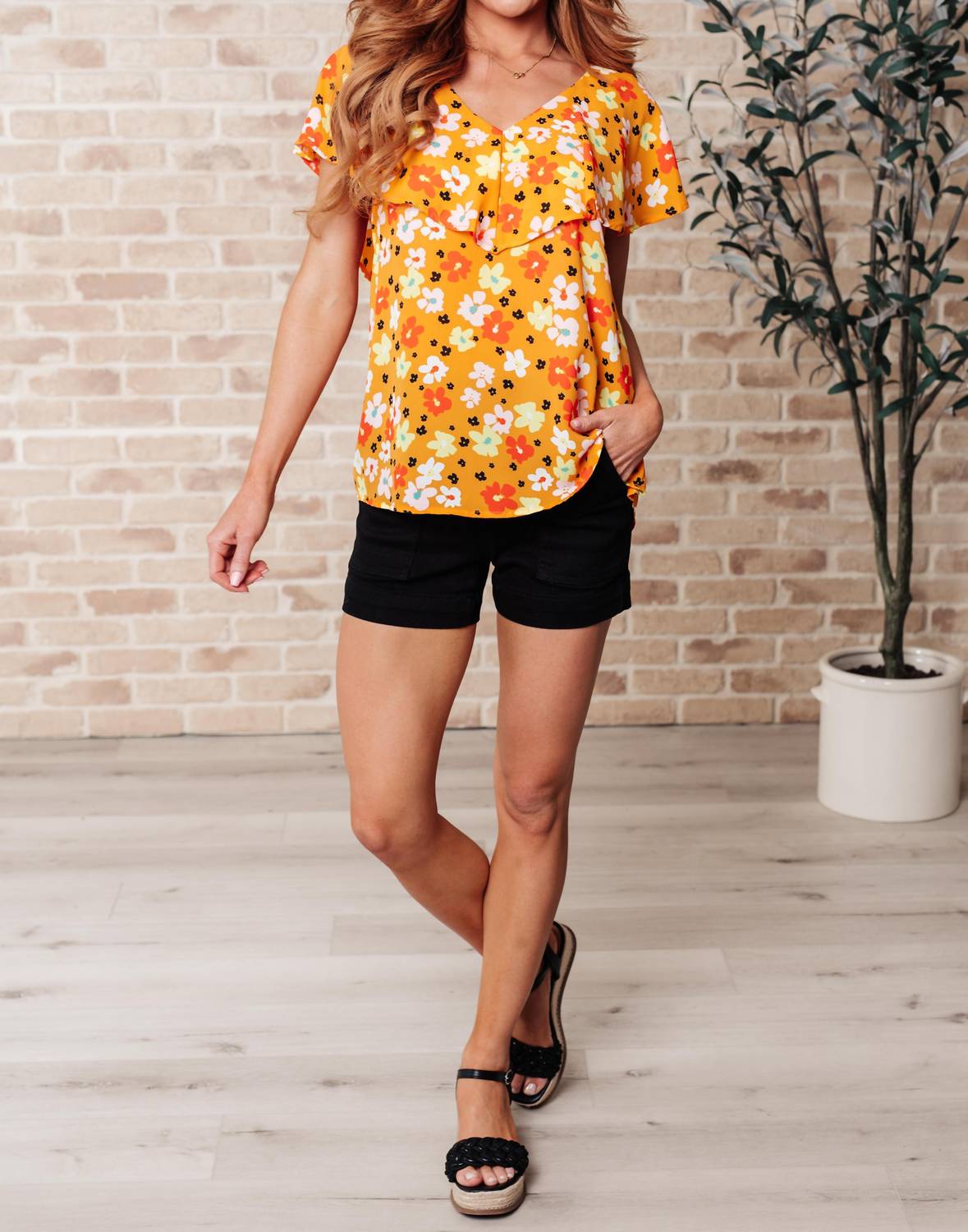 A versatile blouse that works from desk to dinner! Introducing the Freshly Picked Floral Top by ANDREE BY UNIT, a must-have for your summer wardrobe in a vibrant orange hue. This blouse features cap sleeves with ruffle detailing and a flattering V-neckline, providing a chic touch to its floral design. Composition: 100% Polyester with a woven material, offering a lightweight and breezy feel. Closure: Pull on.