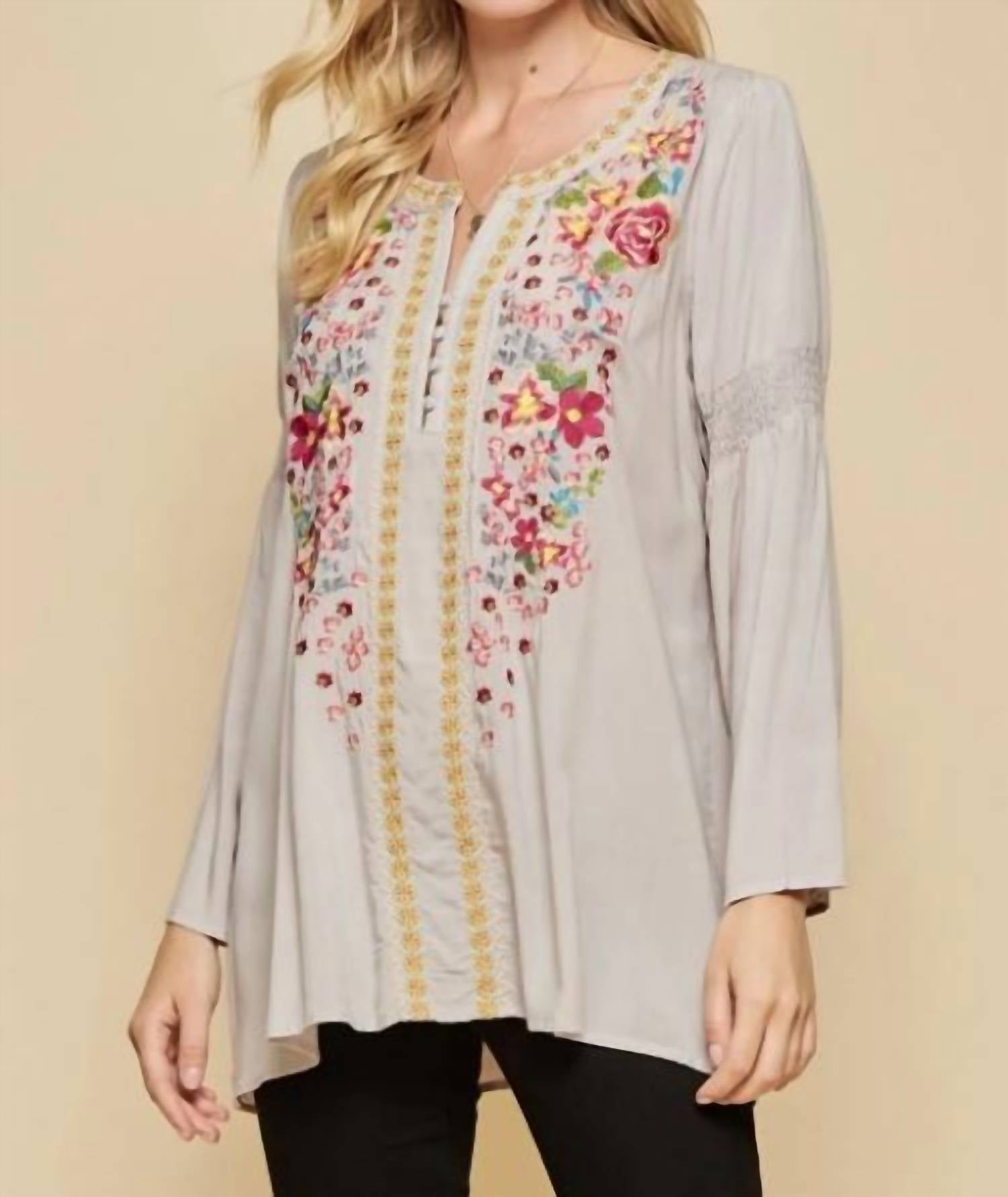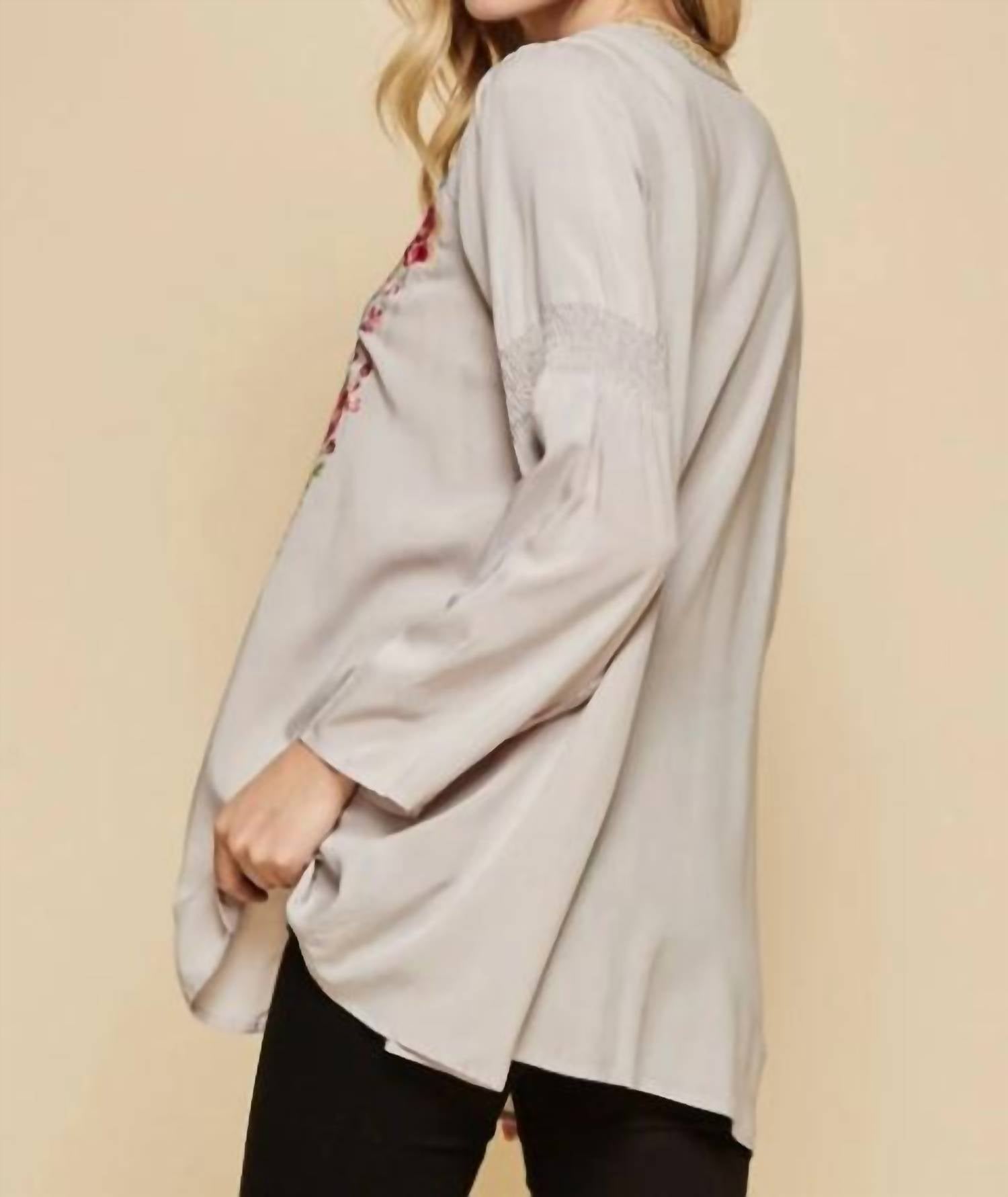 A perfect addition to any wardrobe, this classic tunic style blouse is flattering and effortless. You can easily transition from desk to dinner in this chic top. Introducing the Ocho Rios Embroidered Top by ANDREE BY UNIT, a stunning addition to your summer wardrobe. This plus-size tunic features long sleeves adorned with colorful embroidery and smocking details, a flattering high low hem, and a relaxed a-line fit. Made from 100% woven rayon, it offers a non-stretch, comfortable wear with a button closure for easy styling. Care for this pearl-colored, boho chic piece with hand washing in cold water to maintain its vibrant floral design. Available in sizes 1X to 3X with corresponding bust measurements of 50" to 54" and length of 30".
