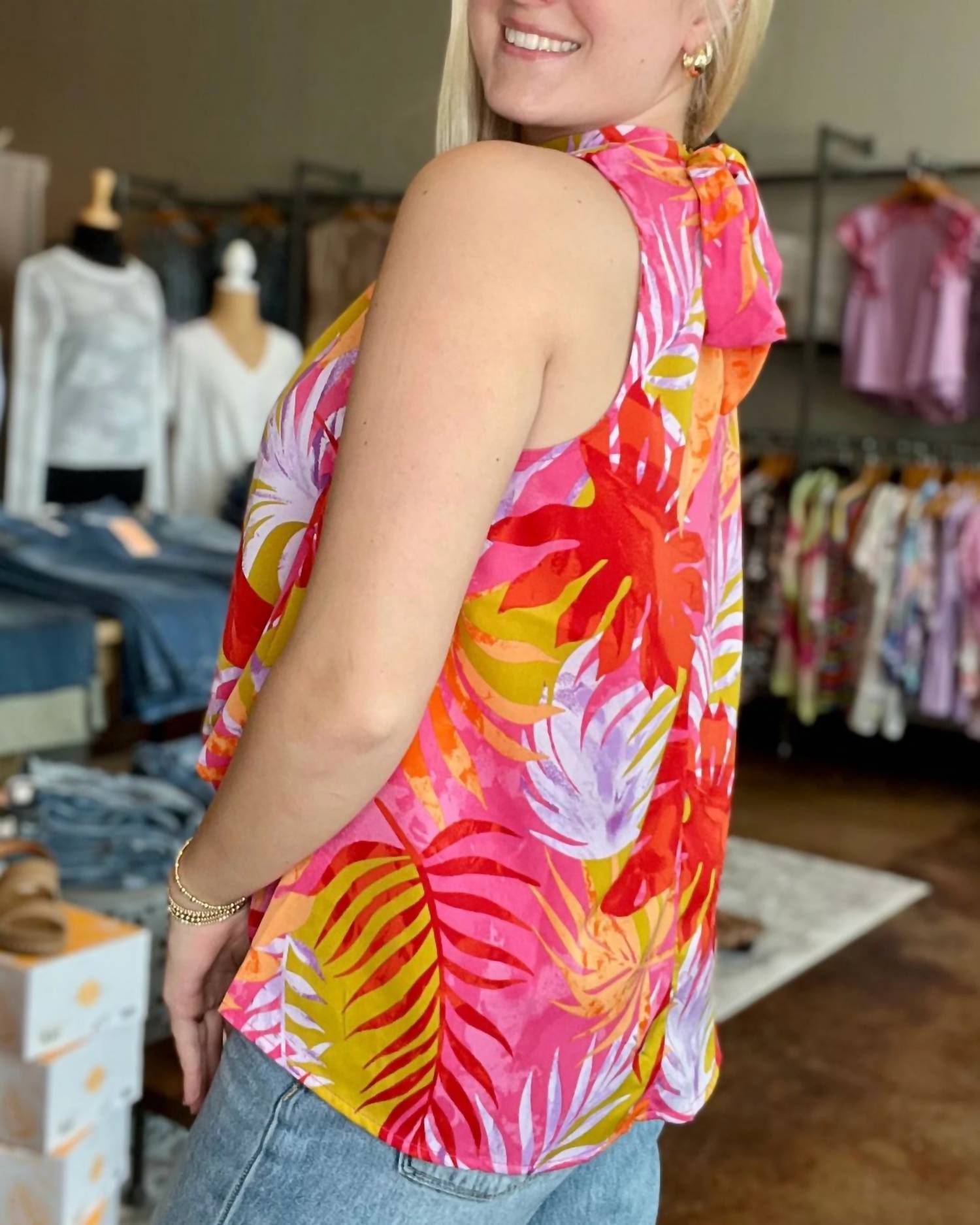 Fit, fabric and functionality. This tank top checks all the boxes. Embrace summer style with the Printed High Neck Top by Andree By Unit, a must-have for your vacation wardrobe. This sleeveless top features a vibrant multicolor pattern and a chic high low hemline. Made from 100% Polyester, it boasts a halter neckline with a tie back ribbon closure for a playful, flowy fit. Care for this piece by hand washing in cold water and laying it flat to dry.