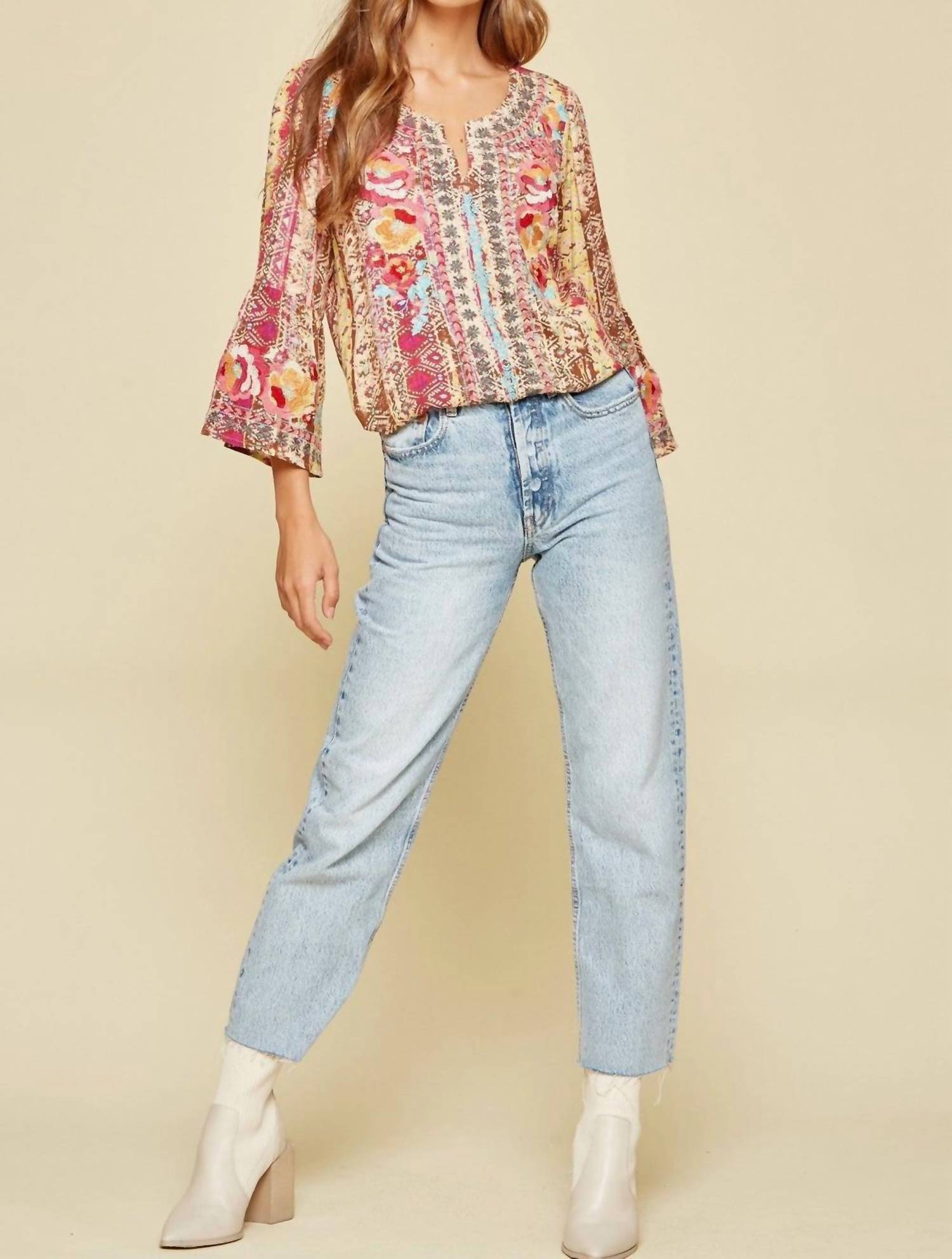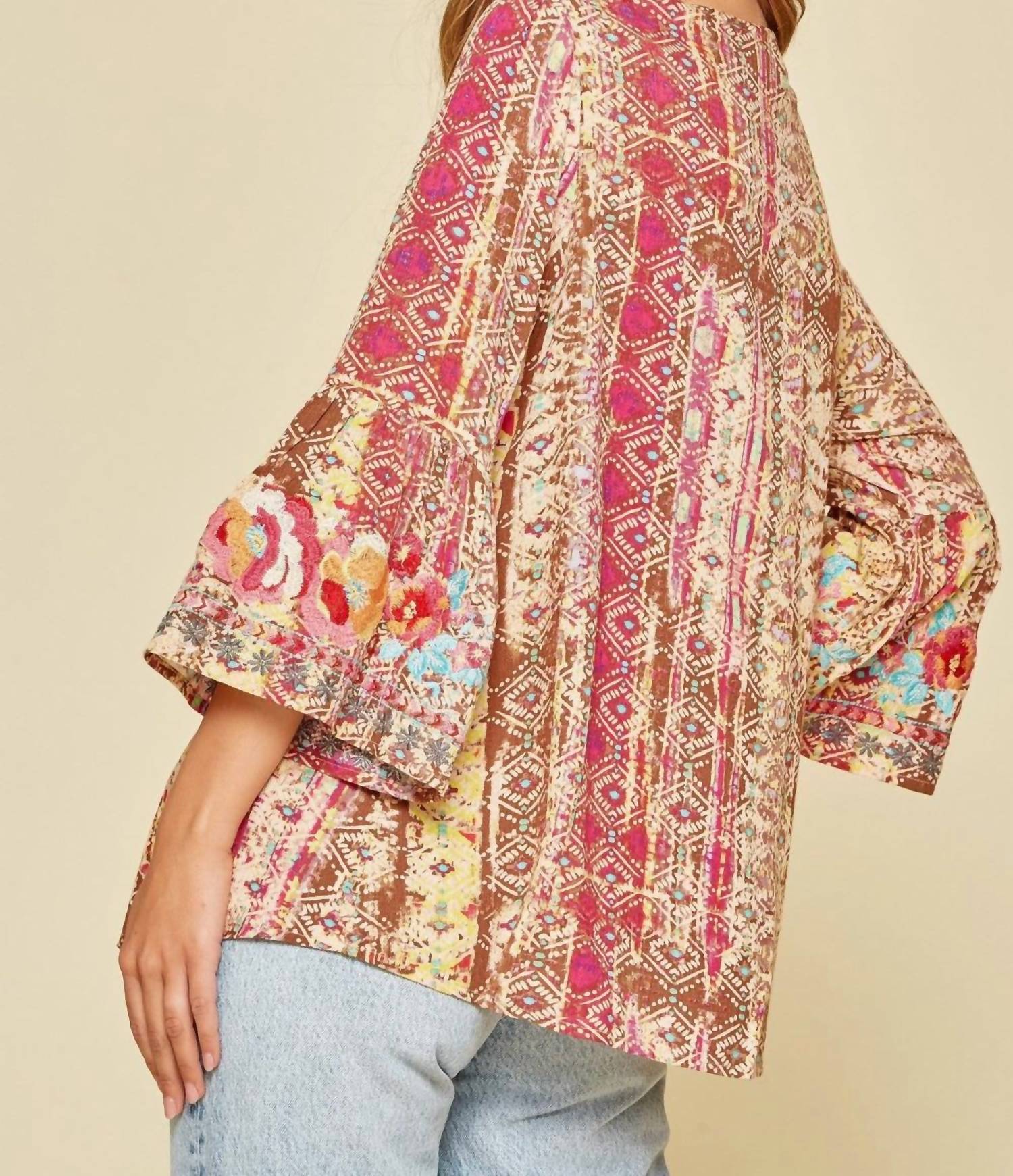 A versatile blouse that works from desk to dinner! Discover the South Beach Embroidered Top by ANDREE BY UNIT, a vibrant addition to your boho chic wardrobe. This three-quarter sleeve blouse boasts colorful embroidery and a split V-neckline, crafted from 100% woven rayon for a relaxed, flowy fit. The top reaches a garment length of 29 inches, and features a convenient pull-on closure. Care for your garment with a simple hand wash while enjoying its uniquely patterned, multicolor design.