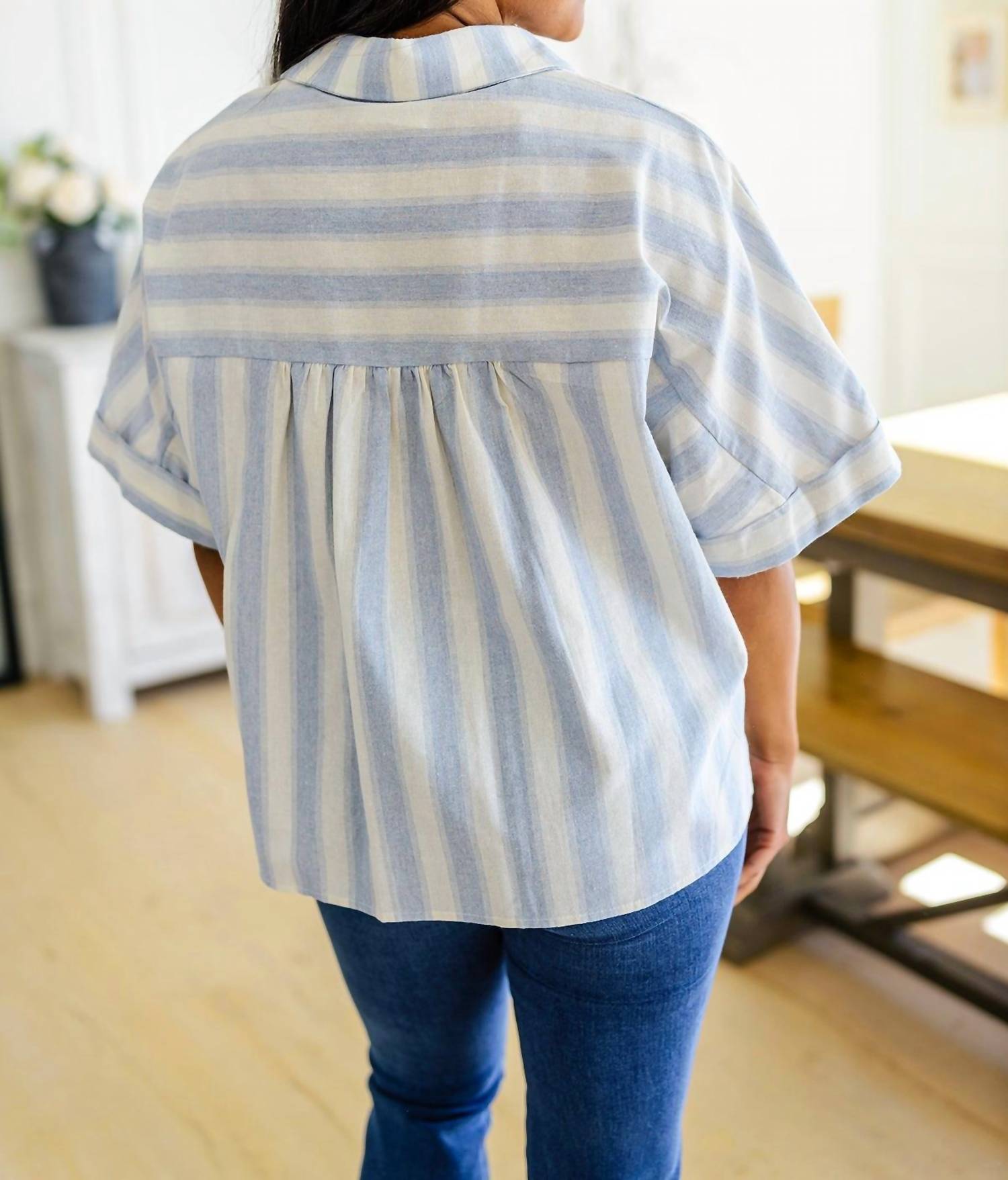 Dolman sleeves, perpendicular striped details. Gathered back panel. Woven Fabric. Button Front Closure. Oversized Fit. Patch Pocket. 50% Cotton, 50% Polyester. True to Size, Oversized Fit.