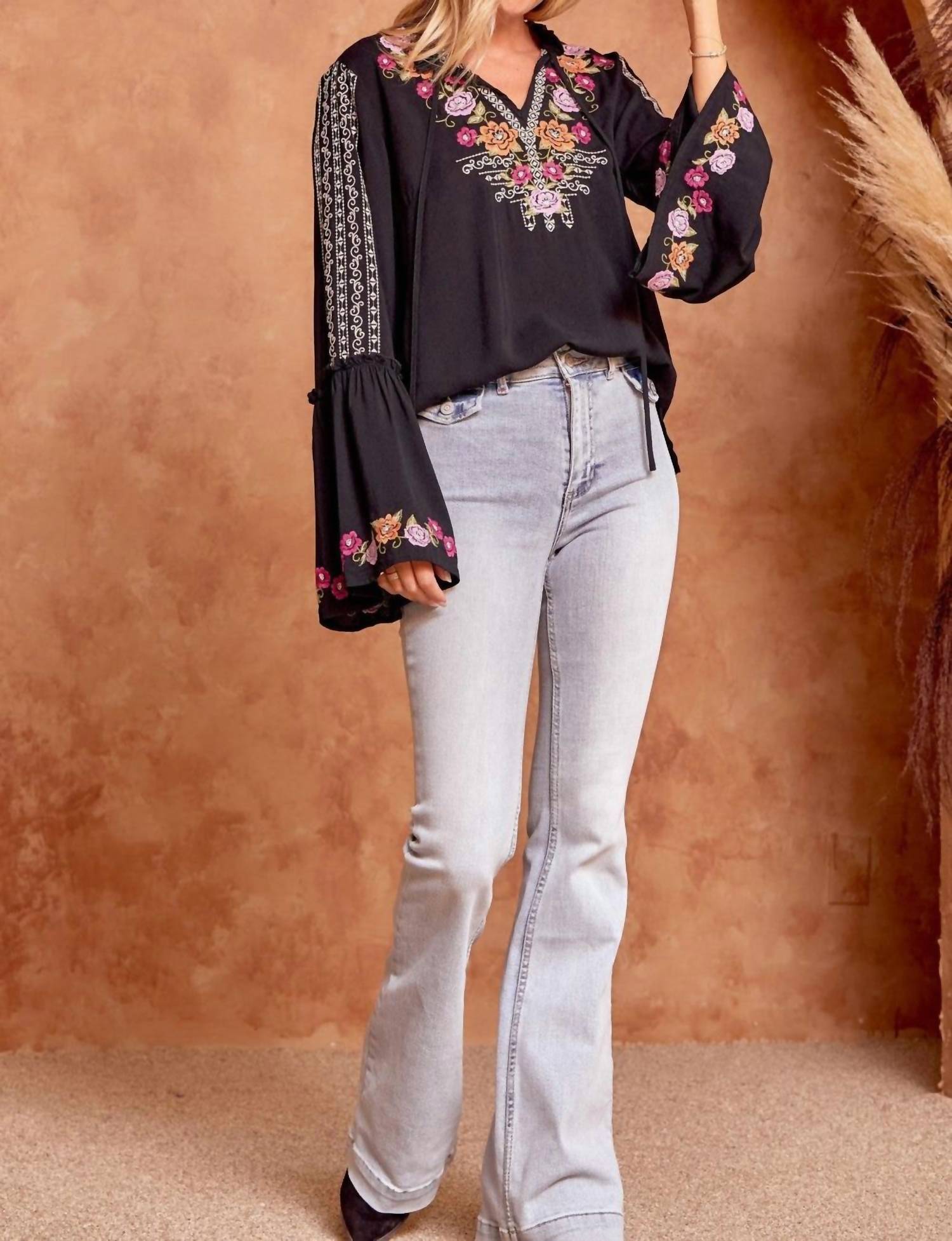 A versatile blouse that works from desk to dinner! Embrace the bohemian charm with the Floral Embroidered Blouse by ANDREE BY UNIT in elegant black. Featuring long bell sleeves and a relaxed A-line silhouette, this blouse showcases intricate embroidery on the bodice and sleeves for a touch of femininity. Composition: 100% Woven Rayon with no stretch. Closure: Tie closure at the split V-neckline. Care: Hand wash cold. Available sizes range from Small (Bust 38", Length 25") to 3X (Bust 52", Length 28").