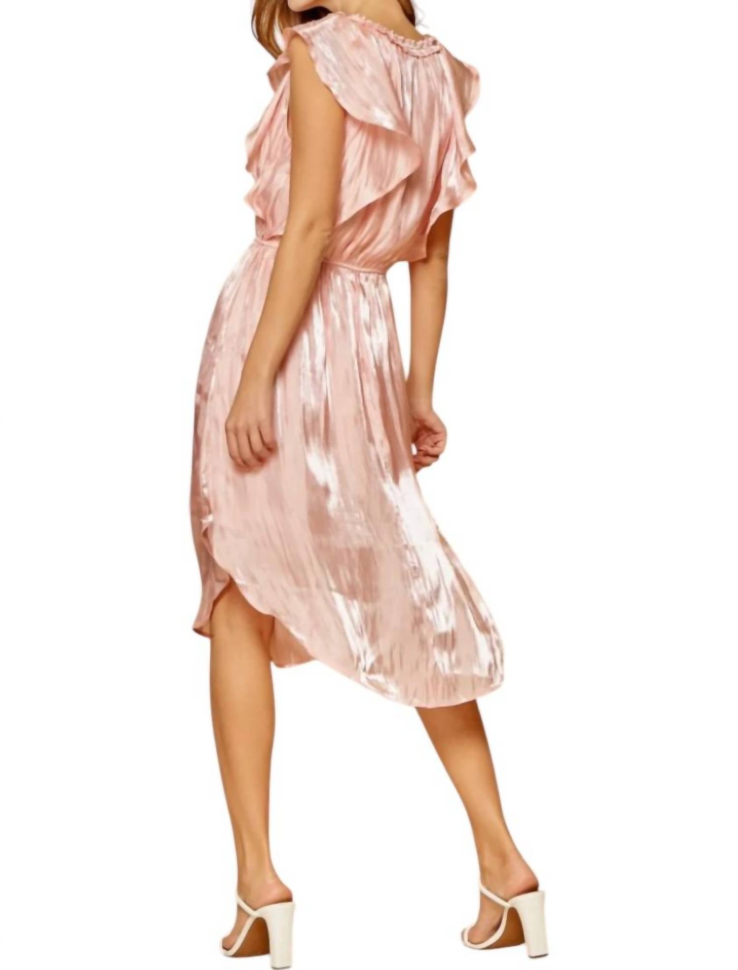 This midi dress features an elastic waistline, lining, and a shimmery finish. It has a V-neck, cap sleeves with ruffle details, and a curved hem. Made from 100% polyester.