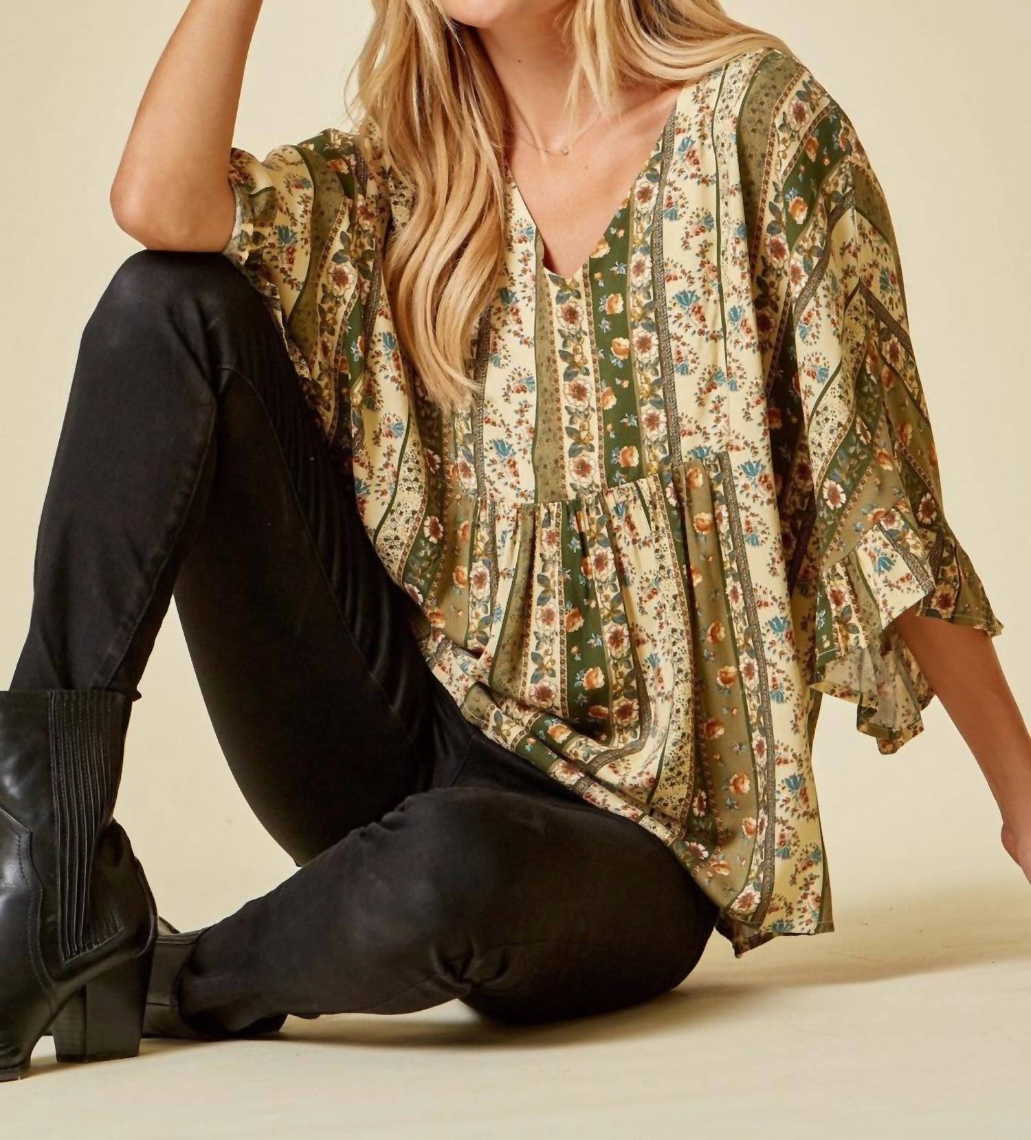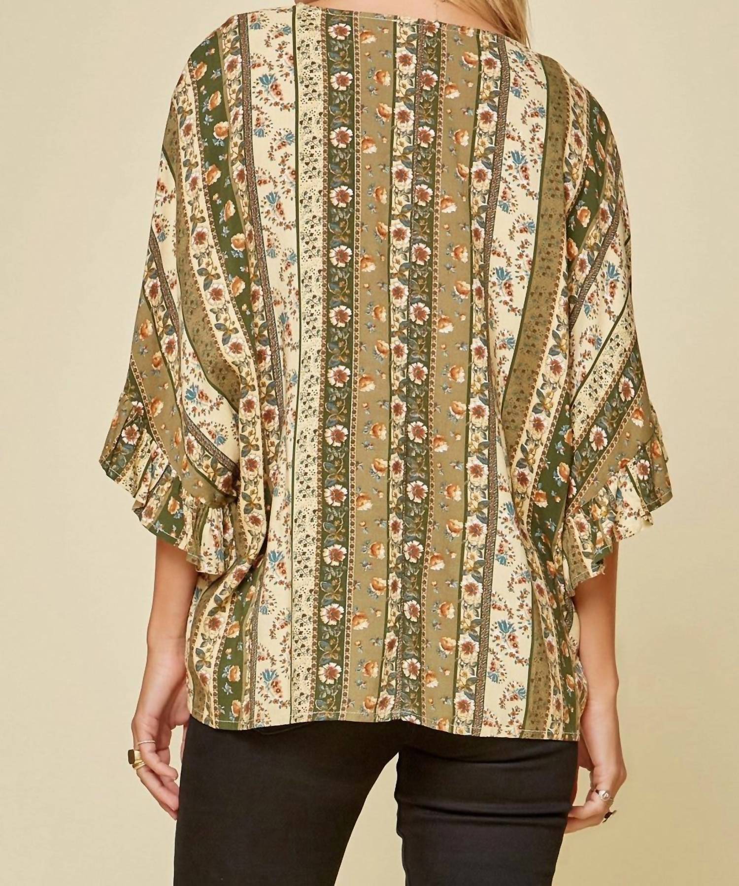 This poncho-like blouse features a V-neckline, dolman ruffle sleeves, pleating, a pretty mixed floral print, and a flowy bodice. Small Bust 50" Length 26. Medium Bust 52" Length 26. Large Bust 54" Length 26. Made of 100% Rayon with no stretch. Hand wash cold.