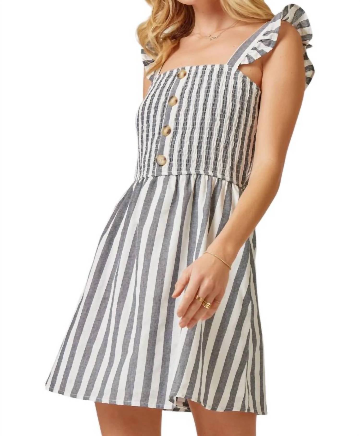 This smocked striped dress features flutter sleeves, a flared skirt, and is lined. It is made from 80% cotton and 20% polyester.