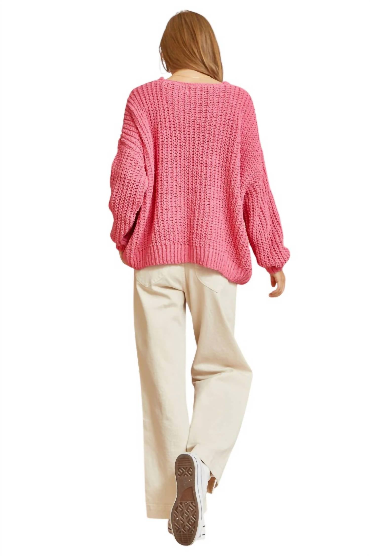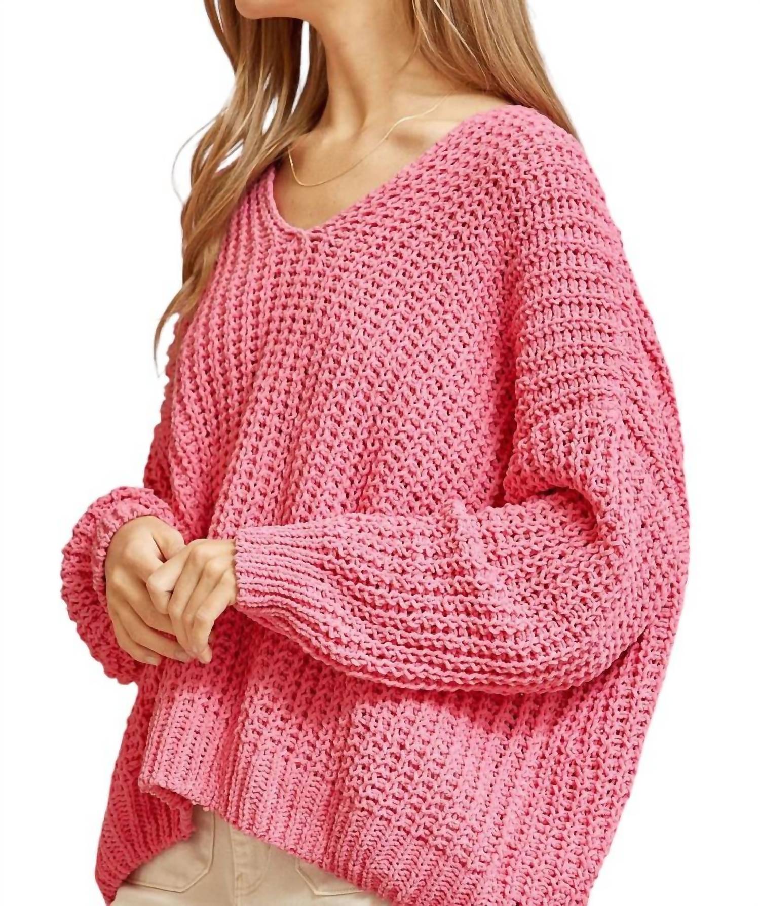 This chunky yarn sweater features a V-neckline, long sleeves, and an oversized fit. It is a knit pull-on style made from 55% acrylic and 45% cotton.