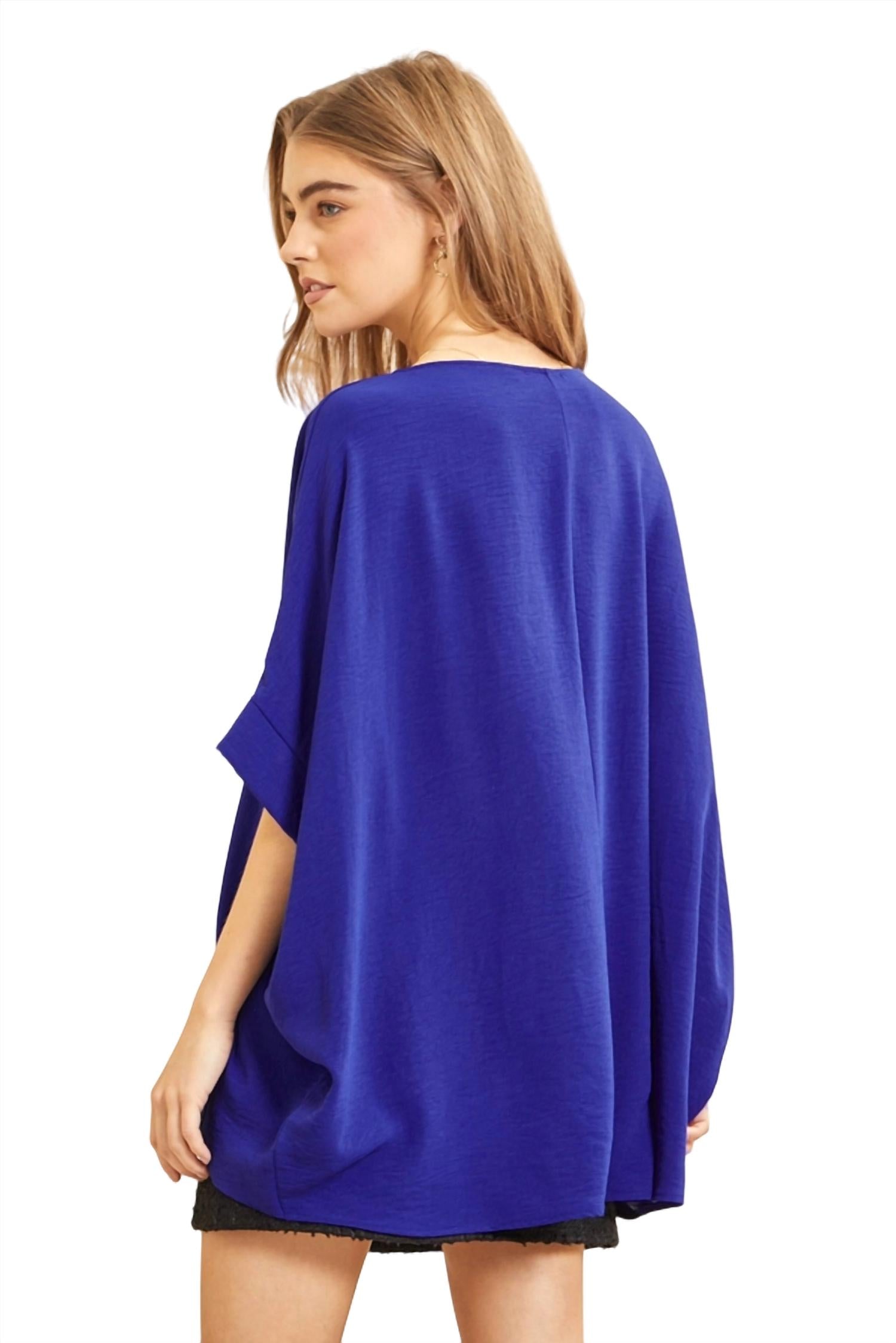 Features a round neckline and dolman sleeves, made from non-sheer fabric composed of 100% polyester.