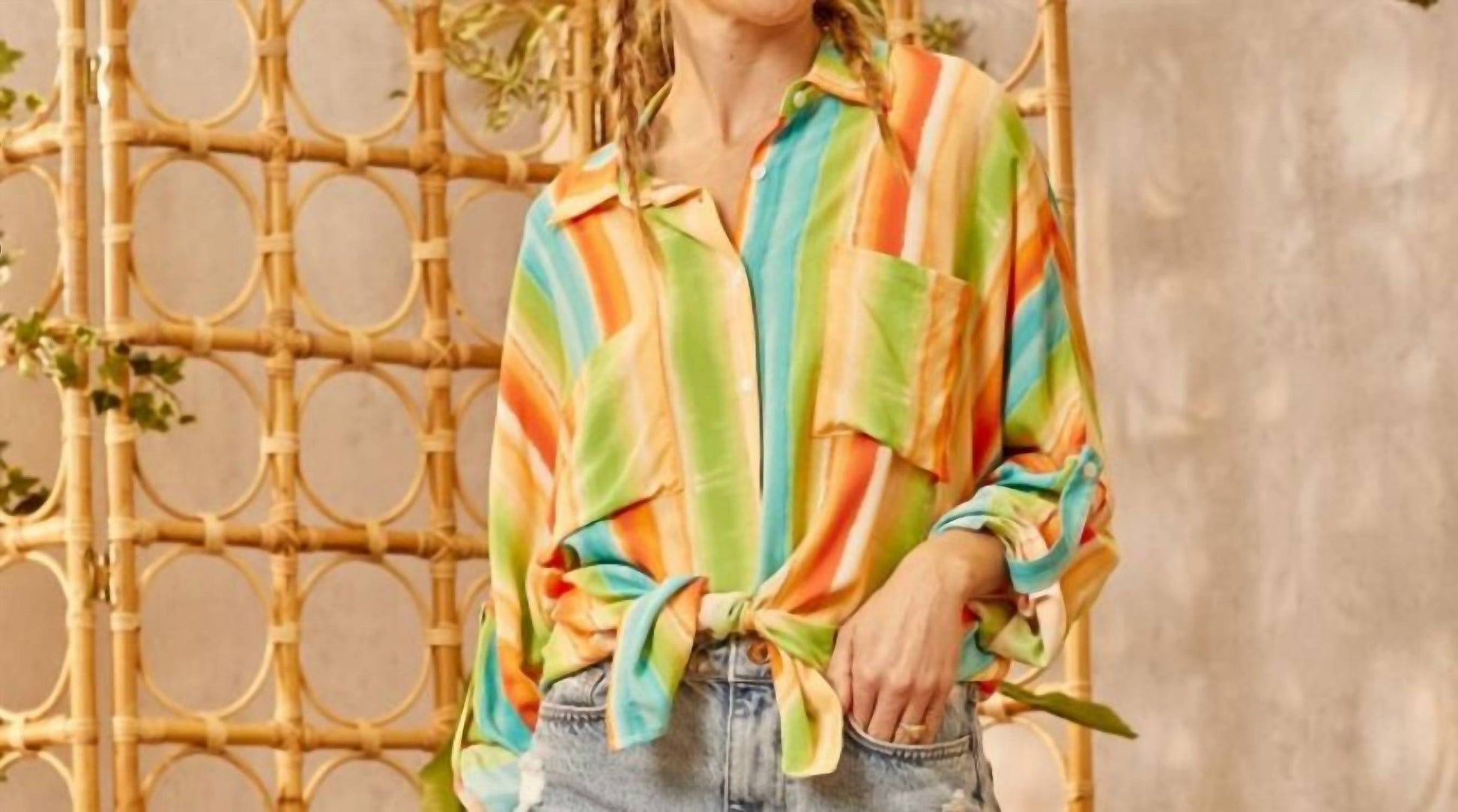 This button down shirt is comfortable yet polished. Add a splash of sunshine to your wardrobe with our Sabrina Button-Up. This lightweight, silky-soft shirt features bold, vertical stripes in vibrant shades of orange, green, yellow, blue, and coral—perfect for brightening up any day. The relaxed fit, front chest pocket, and roll-tab sleeves make it an effortless staple, while the tie-front detail adds a playful twist. Pair it with your favorite denim for a carefree, beachy look or layer it open over a tank for laid-back layering.