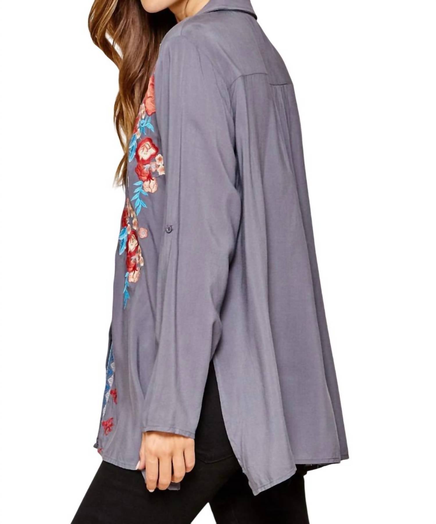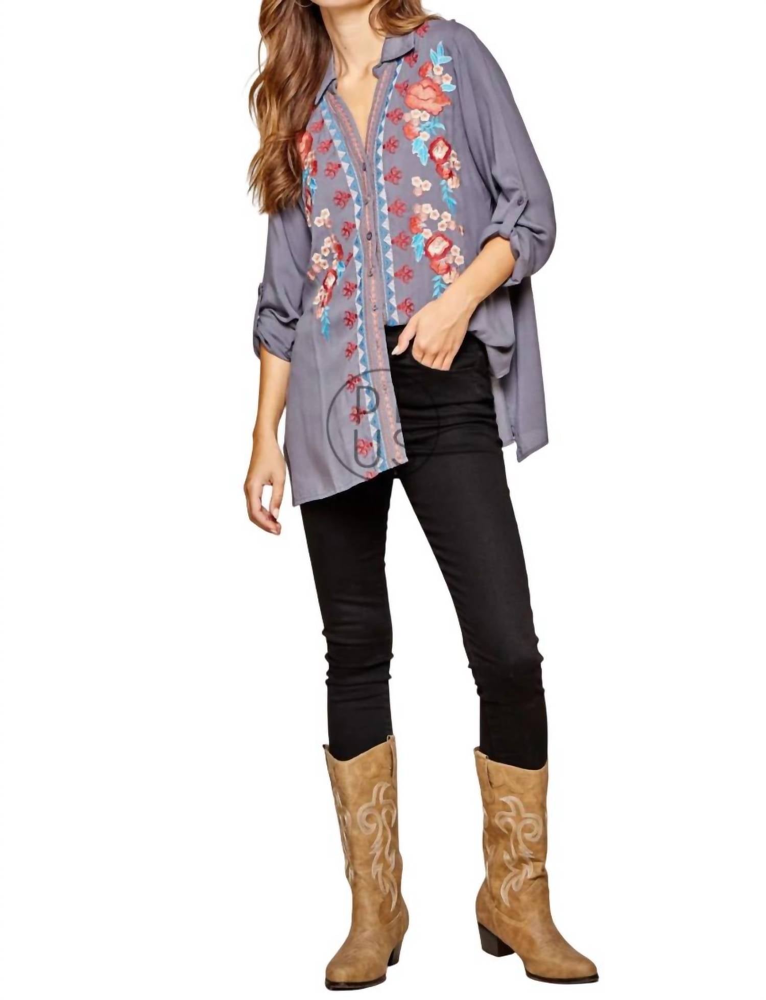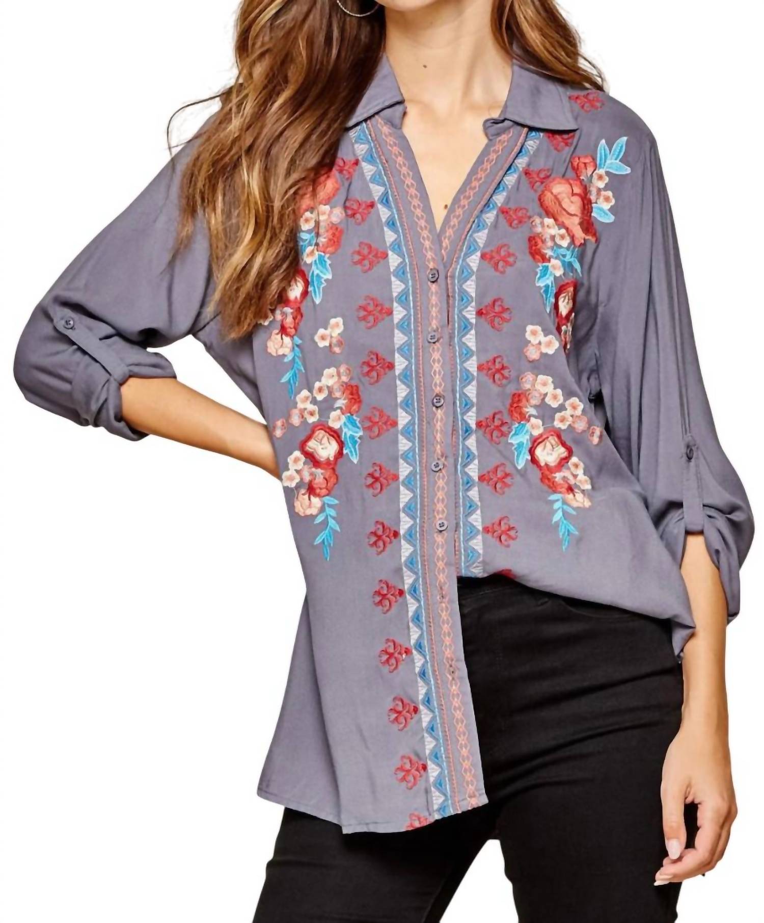 Collared top with button-down front, colorful embroidery, roll-tab sleeves, deep side slits, and a relaxed A-line silhouette. Back is longer. 100% woven rayon, no stretch. Hand wash cold. 1X: Bust 54", Length 29". 2X: Bust 56", Length 29". 3X: Bust 58", Length 29".