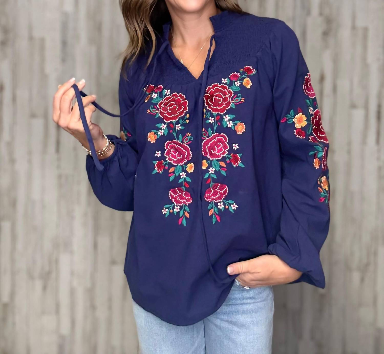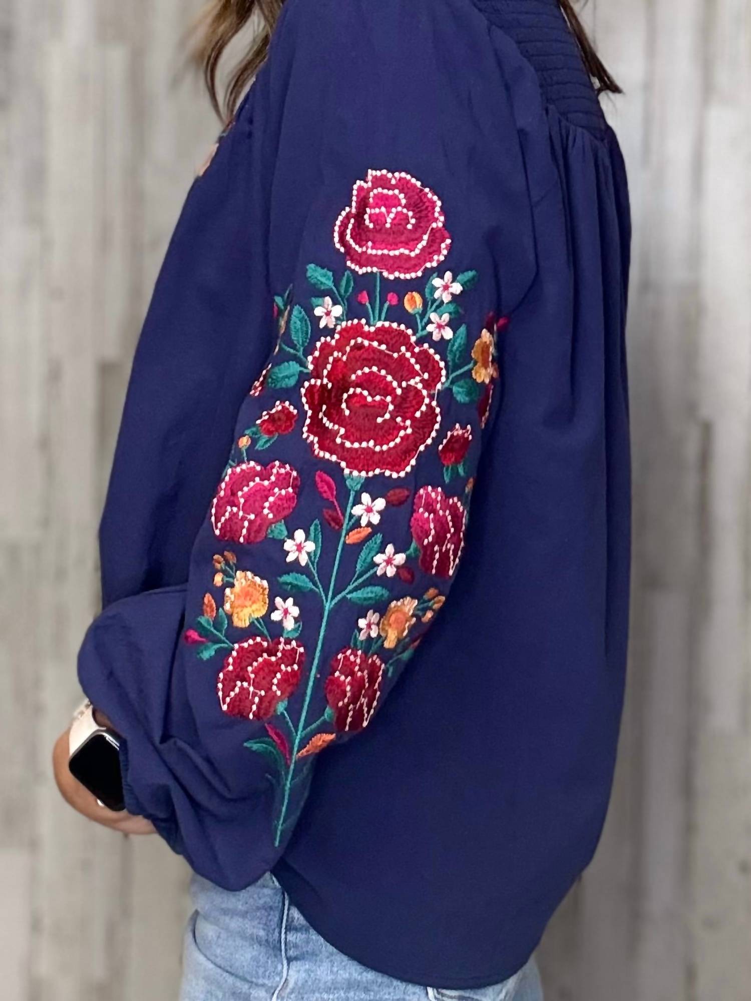 A versatile blouse that works from desk to dinner! Elevate your style with the Stella Floral Embroidery Top by Andree By Unit, designed in a striking navy floral pattern. Featuring long balloon sleeves and crafted from 100% cotton, this top offers a smocked neckline and intricate embroidery details. Closure: Tie closure. Care: Hand wash cold, do not bleach, lay flat to dry. Ideal for casual or dressy occasions, bringing a touch of boho chic to your summer wardrobe.