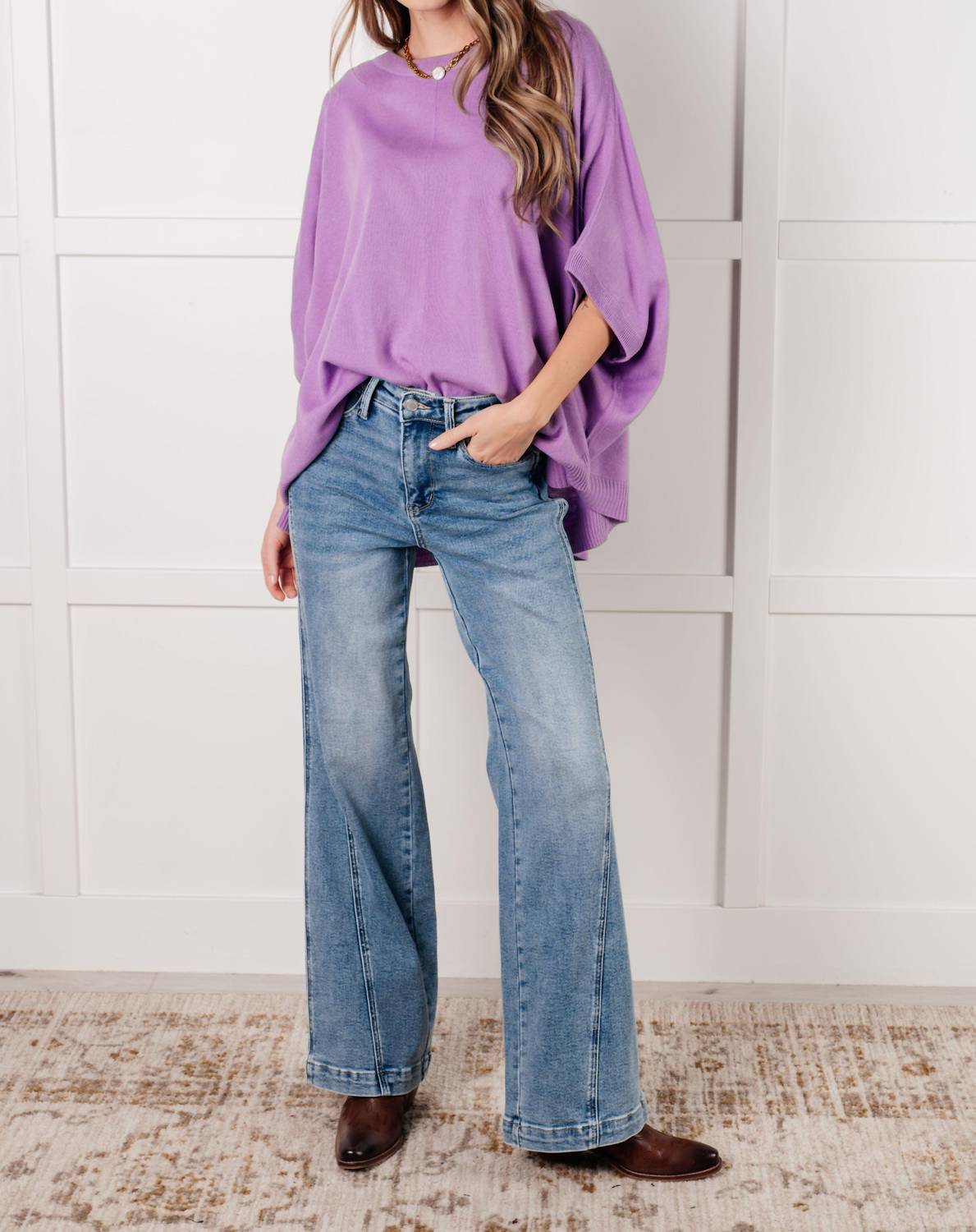 A versatile blouse that works from desk to dinner! Embrace comfort with the Whisper Dolman Sleeve Top by ANDREE BY UNIT in soft lilac. This blouse features three-quarter dolman sleeves and a boat neckline, crafted from 100% acrylic for a lightweight, textured finish. Its poncho-style design includes ribbed details and a scooped hem for that relaxed, oversized fit. Closure: Pull on.