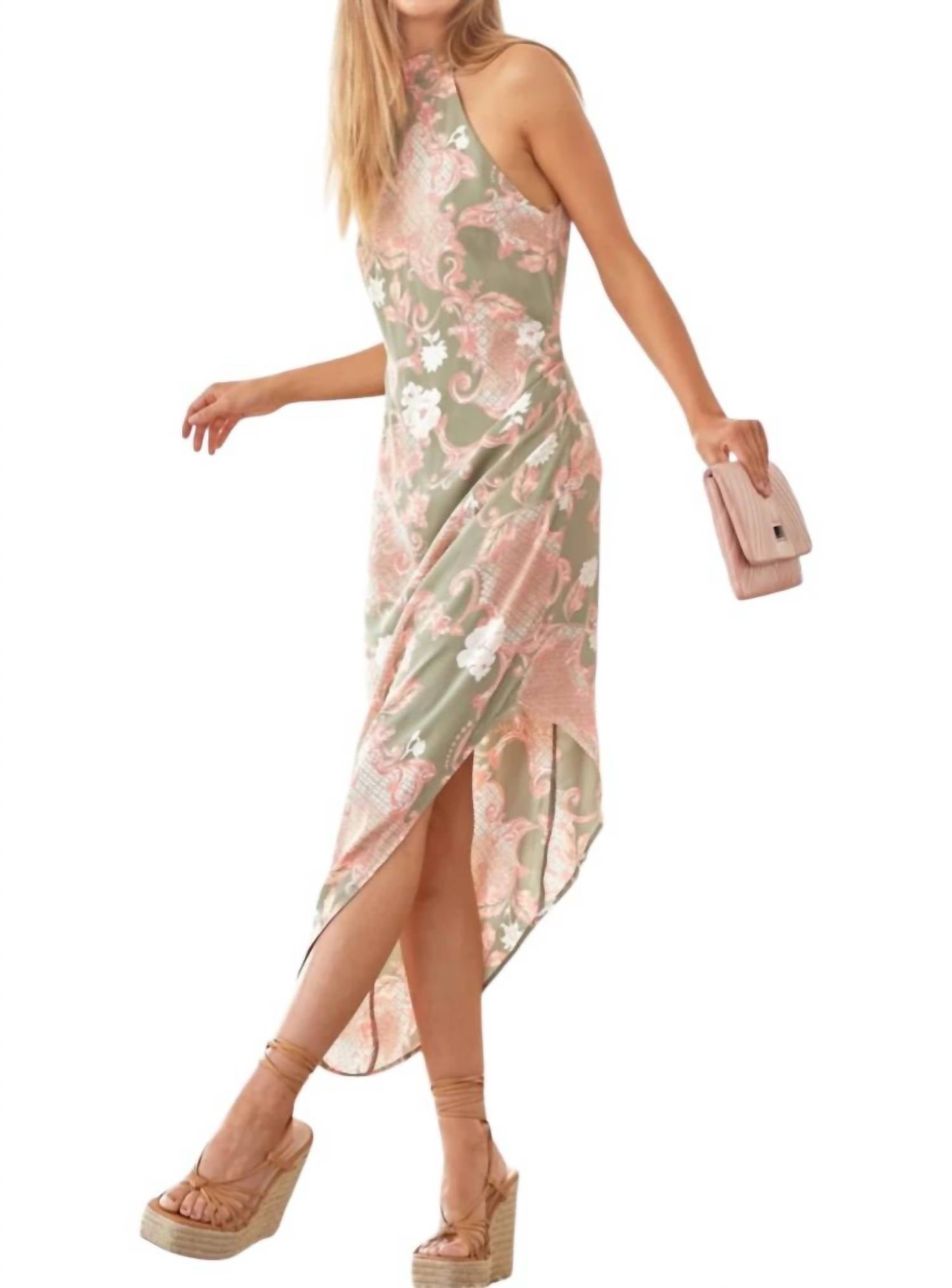 This printed halter dress features side ruching detail, is sleeveless, and has a zip closure. It is made from 100% polyester.