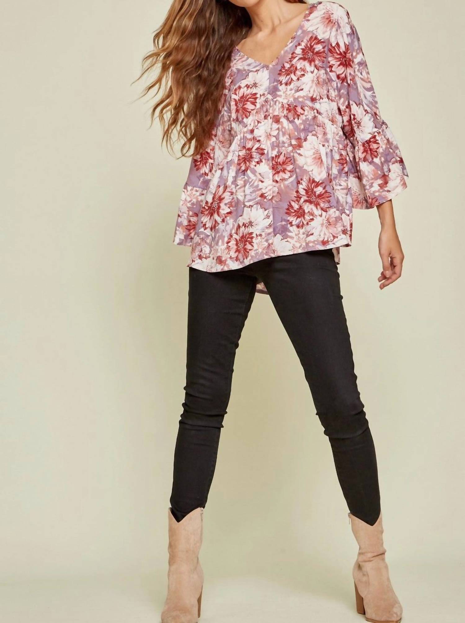 A timeless blouse that will never go out of style. Introducing the Floral Babydoll Blouse by ANDREE BY UNIT, your go-to choice for a fashionable and feminine touch. With its vibrant floral print, this blouse features a V-neckline and three-quarter bell sleeves, offering a stylish flowy silhouette. Made from 100% Rayon with no stretch, it ensures lightweight comfort perfect for any occasion. Care: Hand wash cold for long-lasting wear. Available sizes: Small Bust 40" L 26", Medium Bust 42" L 26", Large Bust 44" L 26"; Plus sizes: 1X Bust 48" Length 30", 2X Bust 50" L 30", 3X Bust 52" L 30".