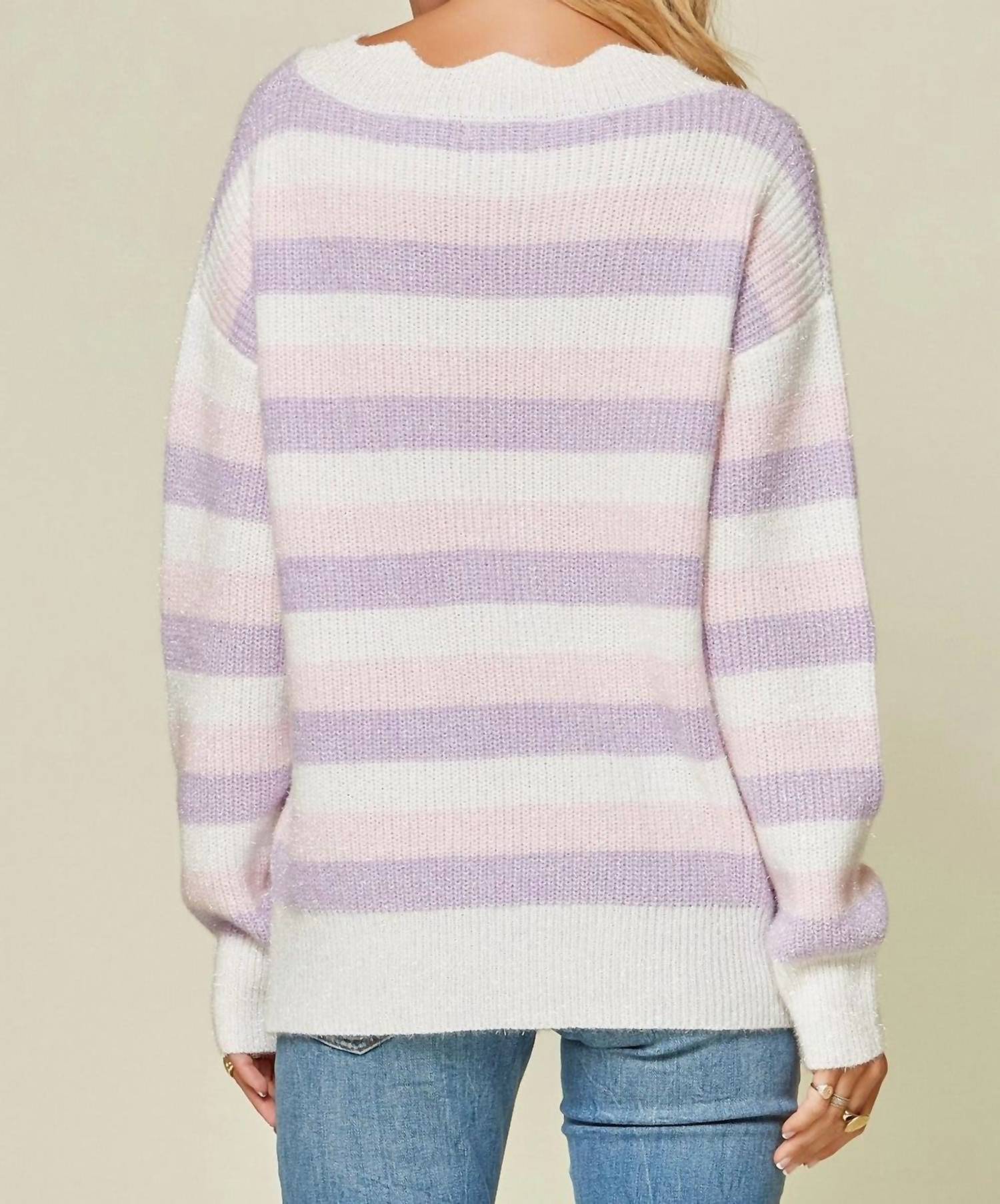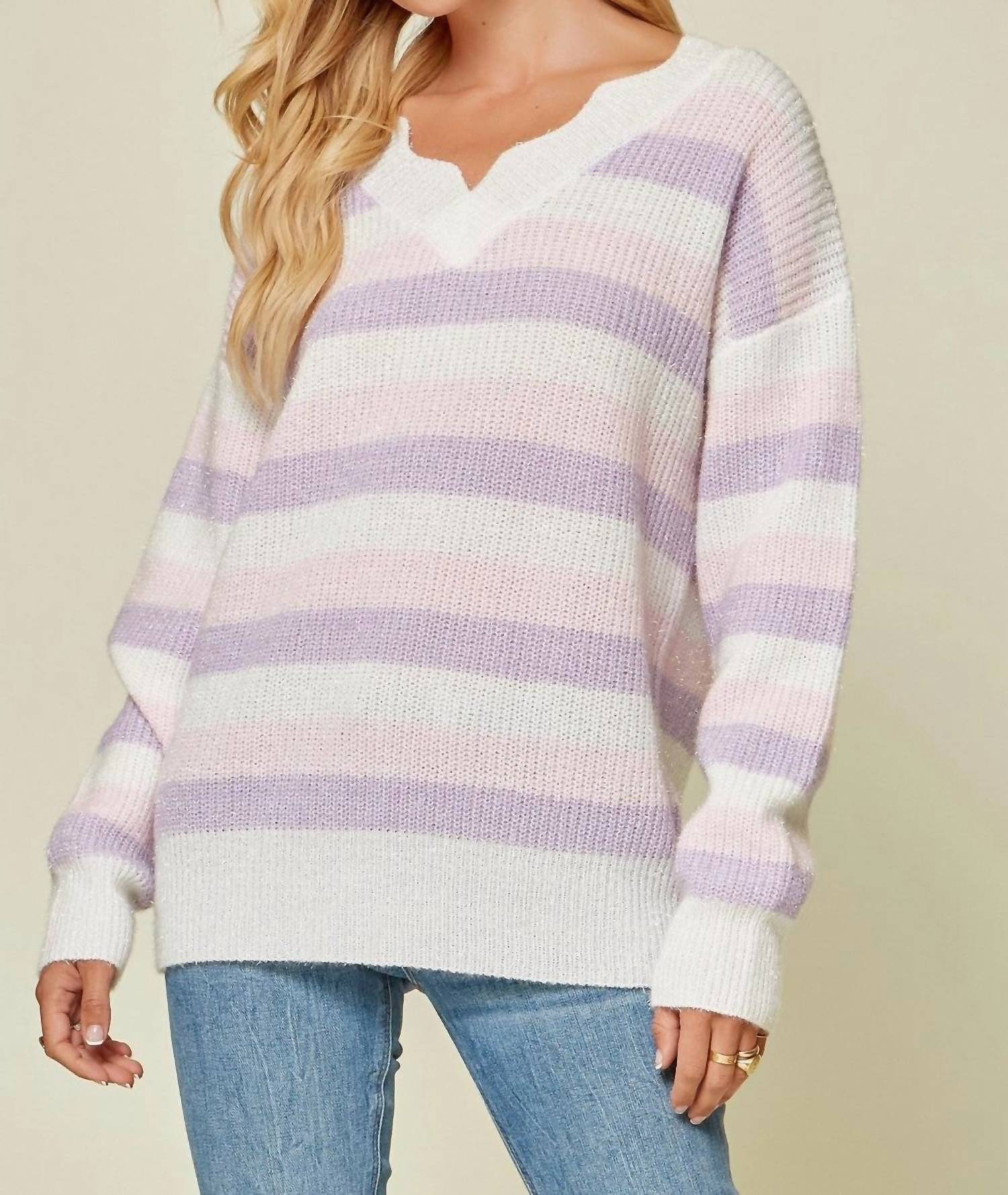 Features a decorative ribbed V-neckline, long sleeves with a ribbed cuff, a ribbed hemline and a pretty striped print (pink, lilac & cream). Small: Bust 42" Length 26", Medium: Bust 44" Length 26", Large: Bust 46" Length 26", 1X: Bust 52" Length 30", 2X: Bust 54" Length 30", 3X: Bust 56" Length 30". 60% Acrylic, 40% Poly with lurex. Hand wash cold.