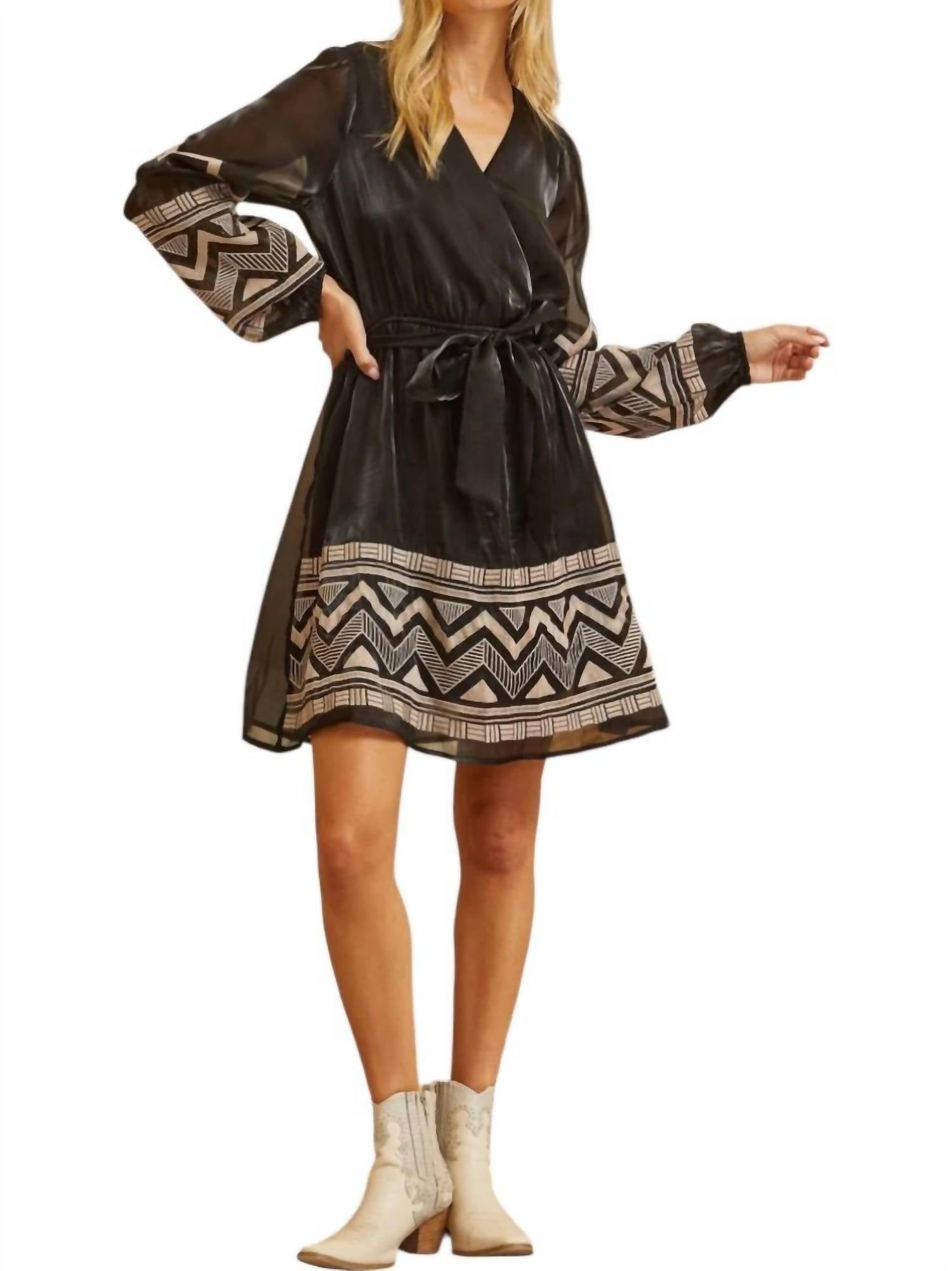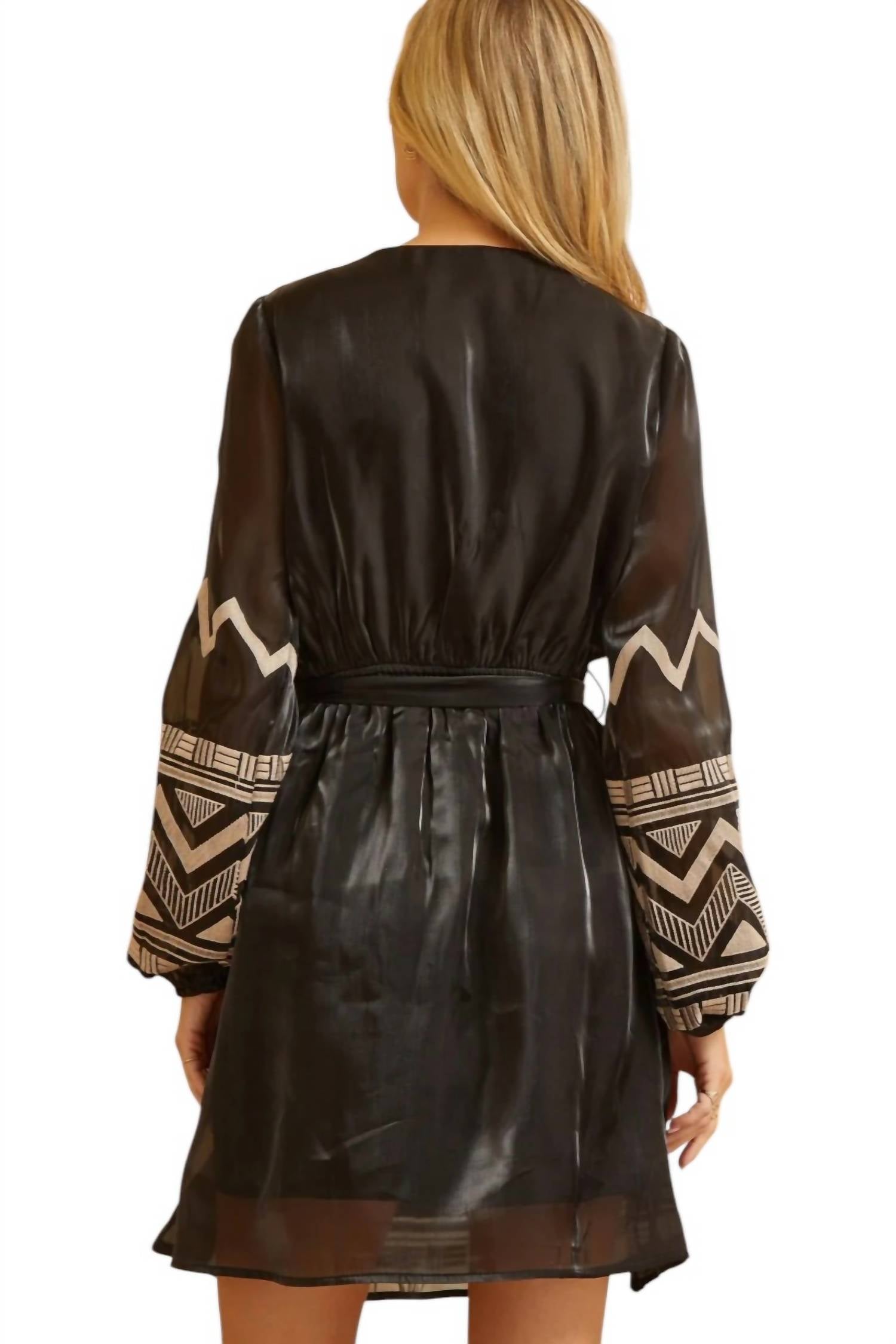This mini dress features embroidery on the hem and sleeves, a tie waist, long sleeves, and a wrap detail with a V-neck. It is lined and made from 100% polyester.