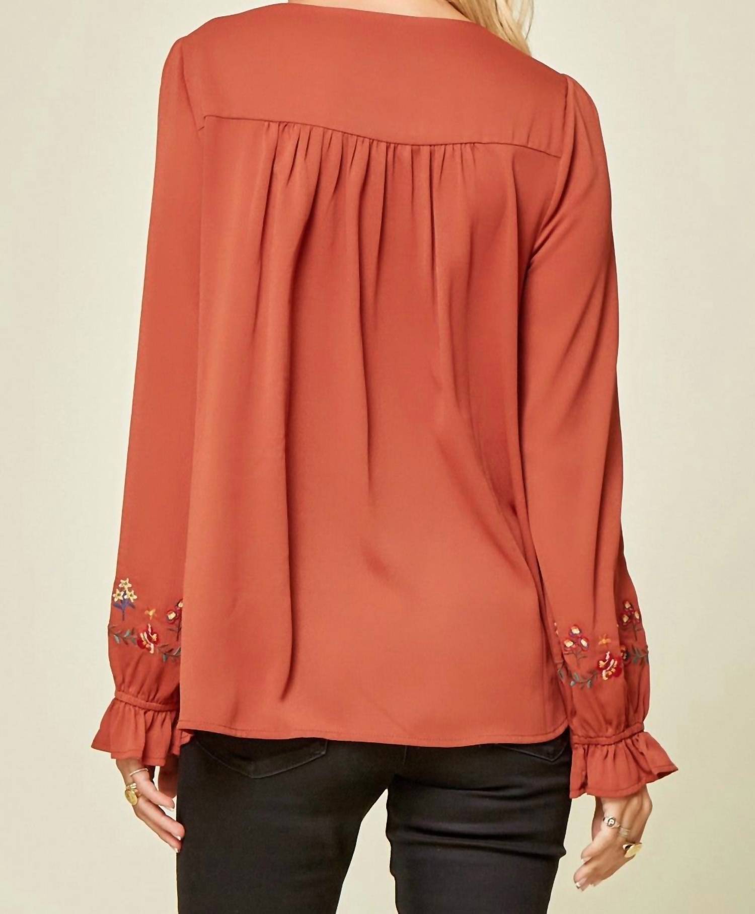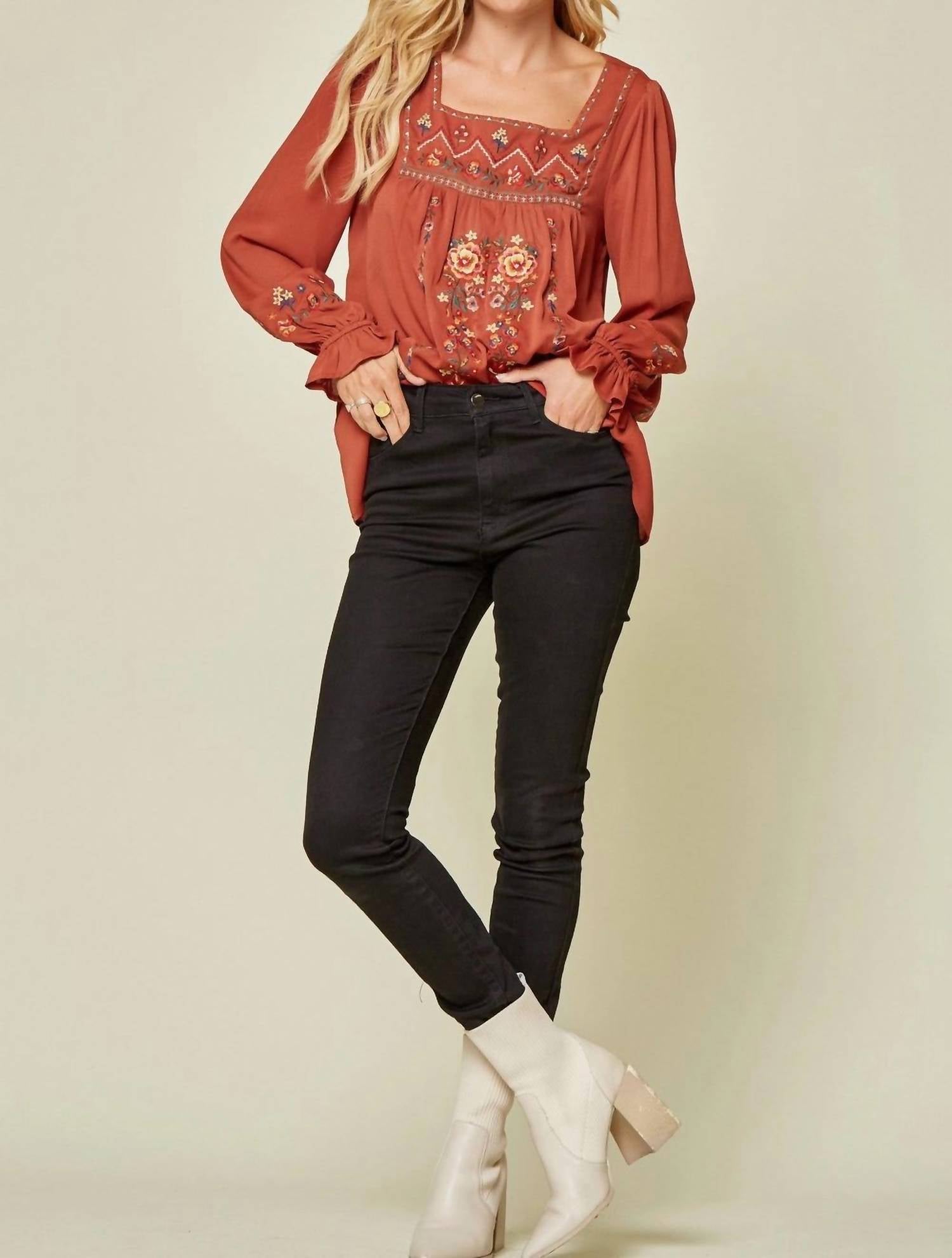 A timeless blouse that will never go out of style. Introducing the Embroidered Babydoll Top by Andree By Unit in a captivating rust tone for a chic boho look. Featuring long sleeves with an elastic ruffle detail, a square neckline, and colorful floral embroidery, this top exudes elegance. Crafted from 100% polyester with a relaxed A-line fit, it offers ease of wear with its pull-on closure. Garment Length: 27 inches. Care: Hand wash cold. Available in sizes Small to 3X, with bust measurements up to 52 inches.