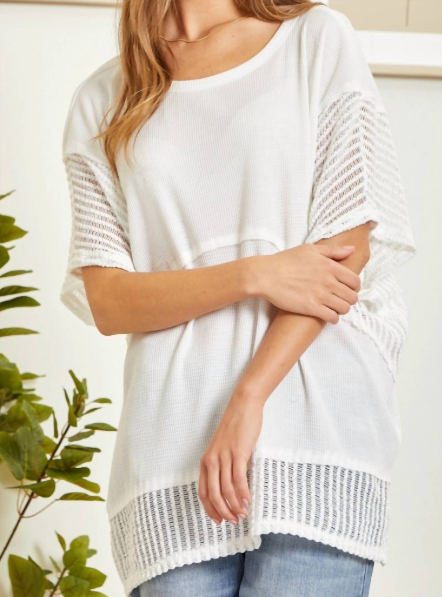 Effortlessly chic and breezy, this lightweight knit top is perfect for laid-back days. Featuring a relaxed fit and sheer details on the sleeves and hem, it combines comfort with subtle sophistication. Style it with your favorite denim for a casual look or layer it over a cami for an elevated vibe. A must-have staple for every season!