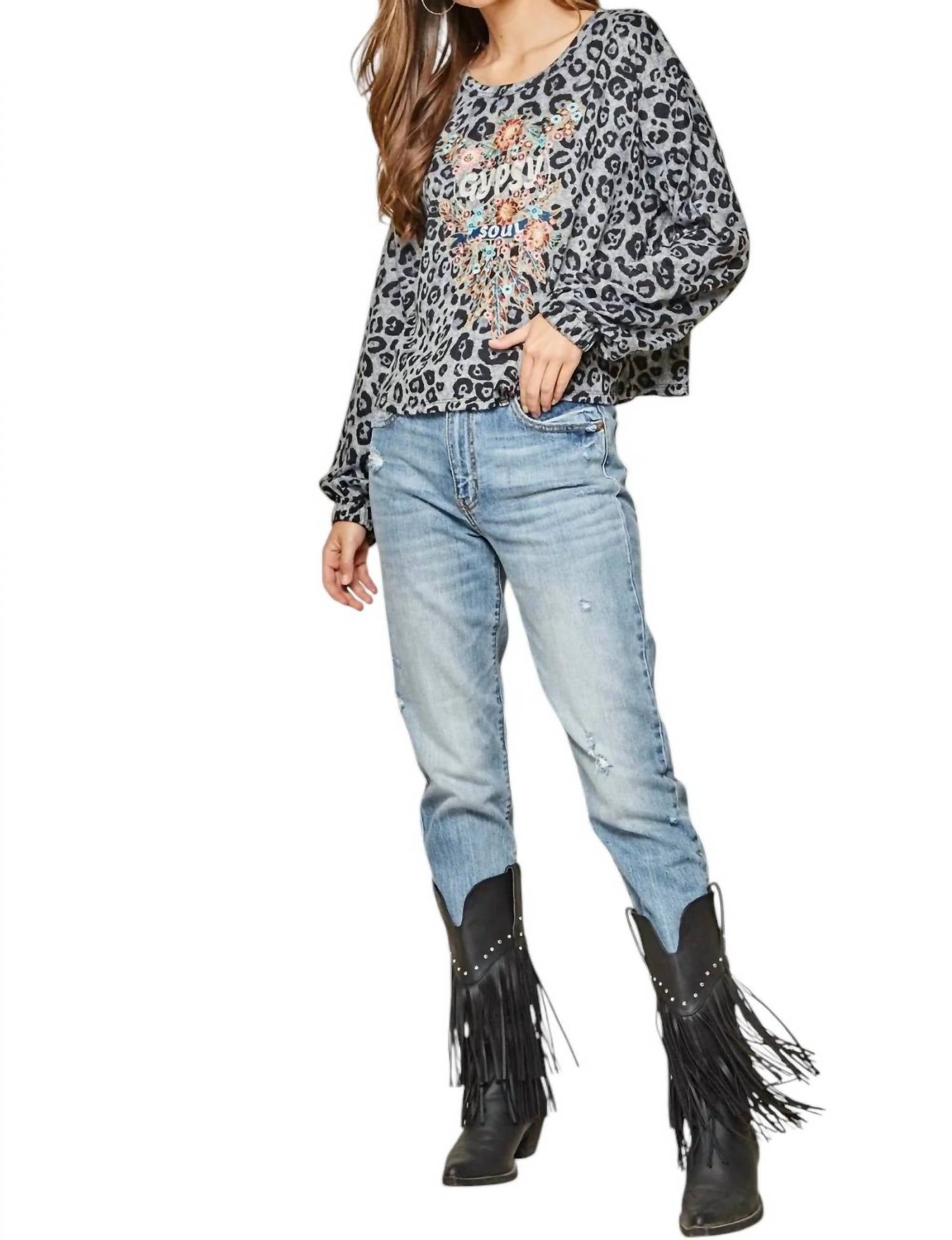This gorgeous embroidered top features a round neckline, dropped shoulders, long balloon sleeves with elastic, and colorful embroidery on a leopard print. Made from 96% polyester and 4% spandex. Length: 22" (regular size), 25" (plus size). Hand wash cold.