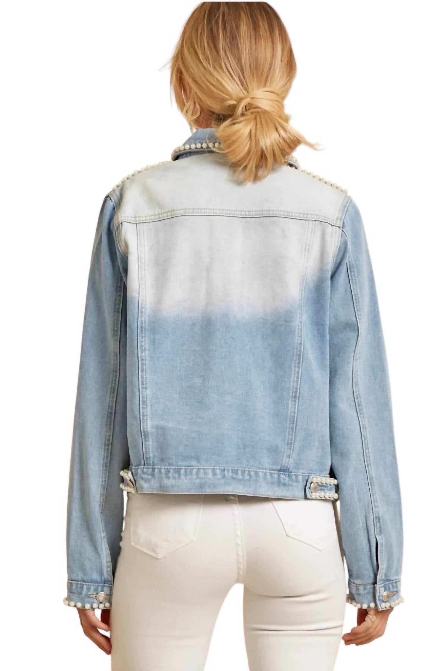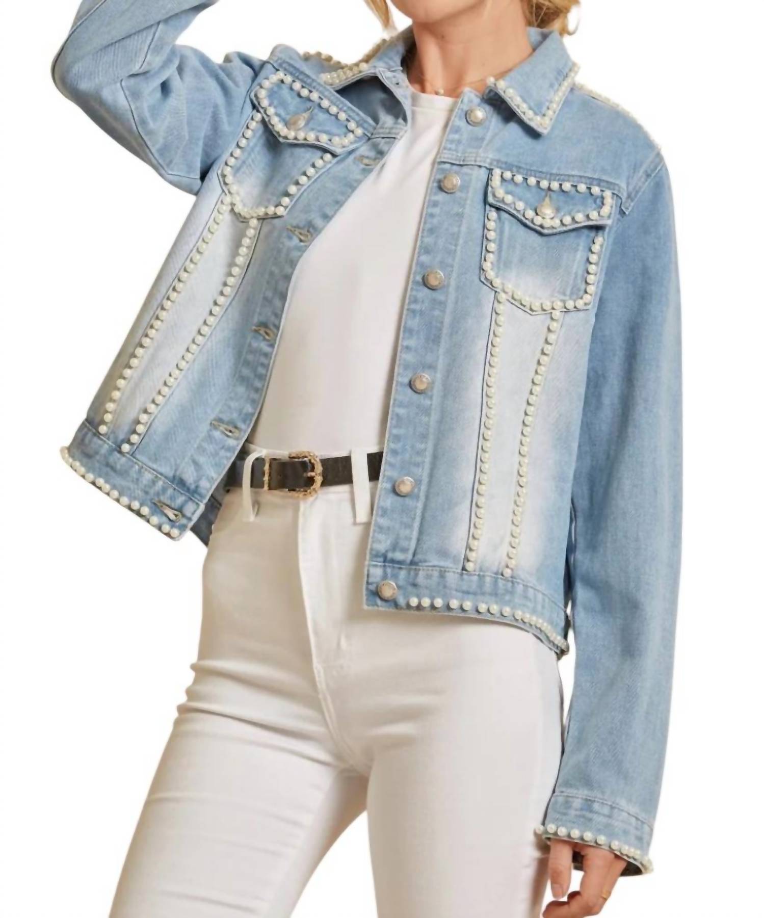 This denim jacket features pearl details throughout, double-breasted front pockets, long sleeves, and a collared design with a button front. Made from 90% cotton and 10% polyester.
