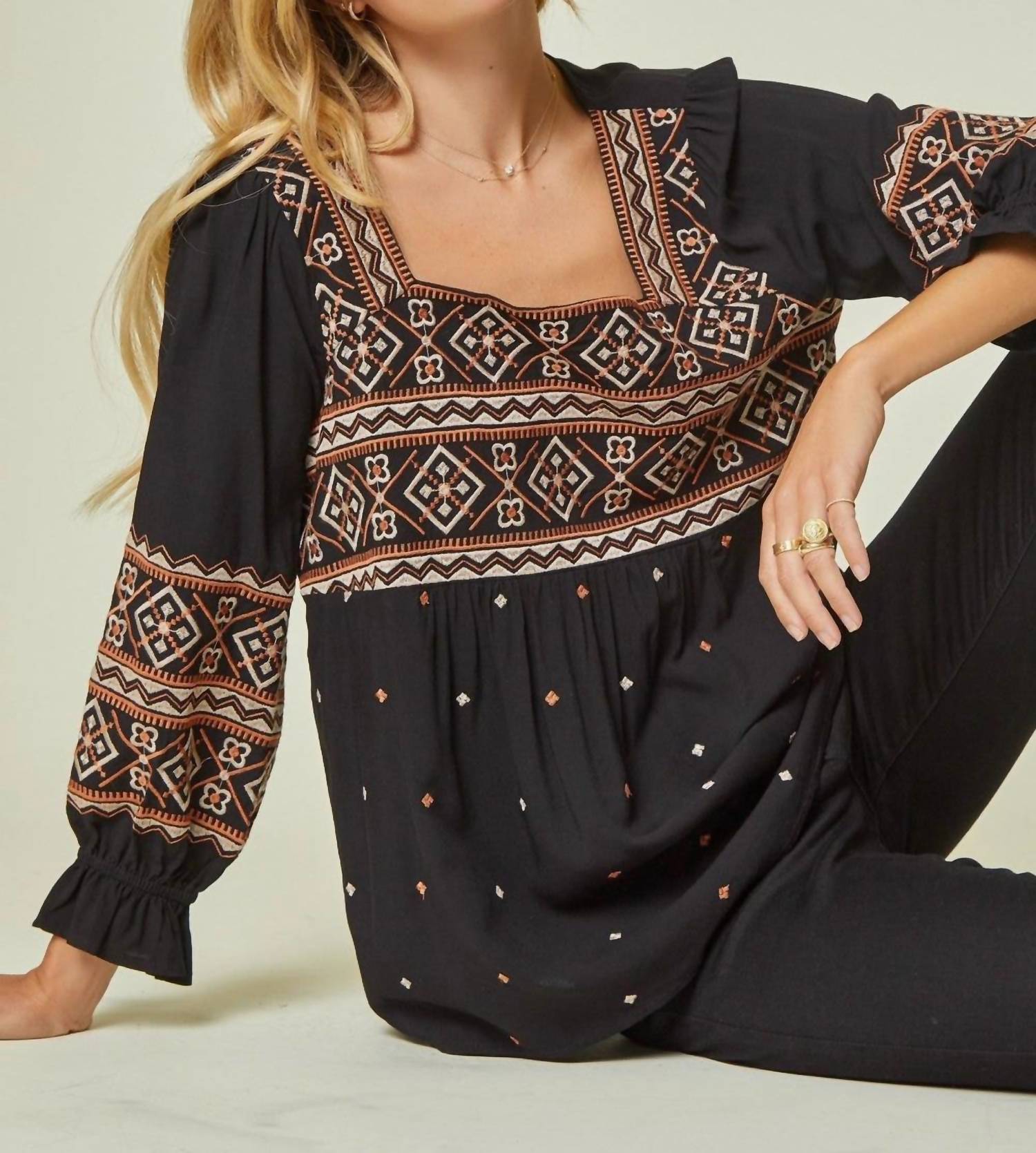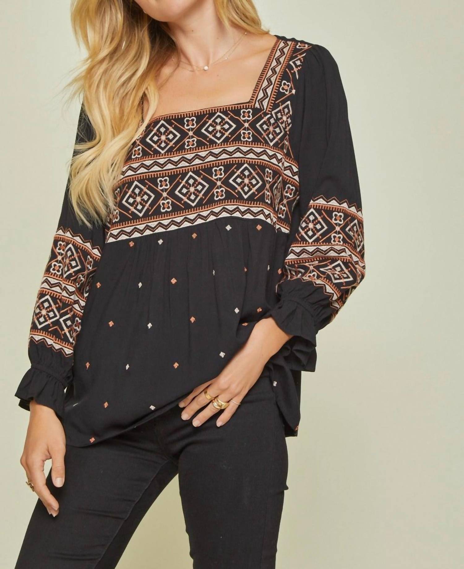 A versatile blouse that works from desk to dinner! Introducing the Aztec Embroidered Babydoll Top by ANDREE BY UNIT, a stunning black blouse designed for a chic Boho vibe. This top features elegant long sleeves with elastic ruffle details and a striking square neckline. Crafted from 100% Rayon with aztec-inspired embroidery, it offers a relaxed A-line fit, measuring 25 inches in length. Closure: Pull-on design. Care: Hand wash cold for longevity and to maintain its vibrant style. Available in sizes ranging from Small (Bust 38") to 3X (Bust 52").