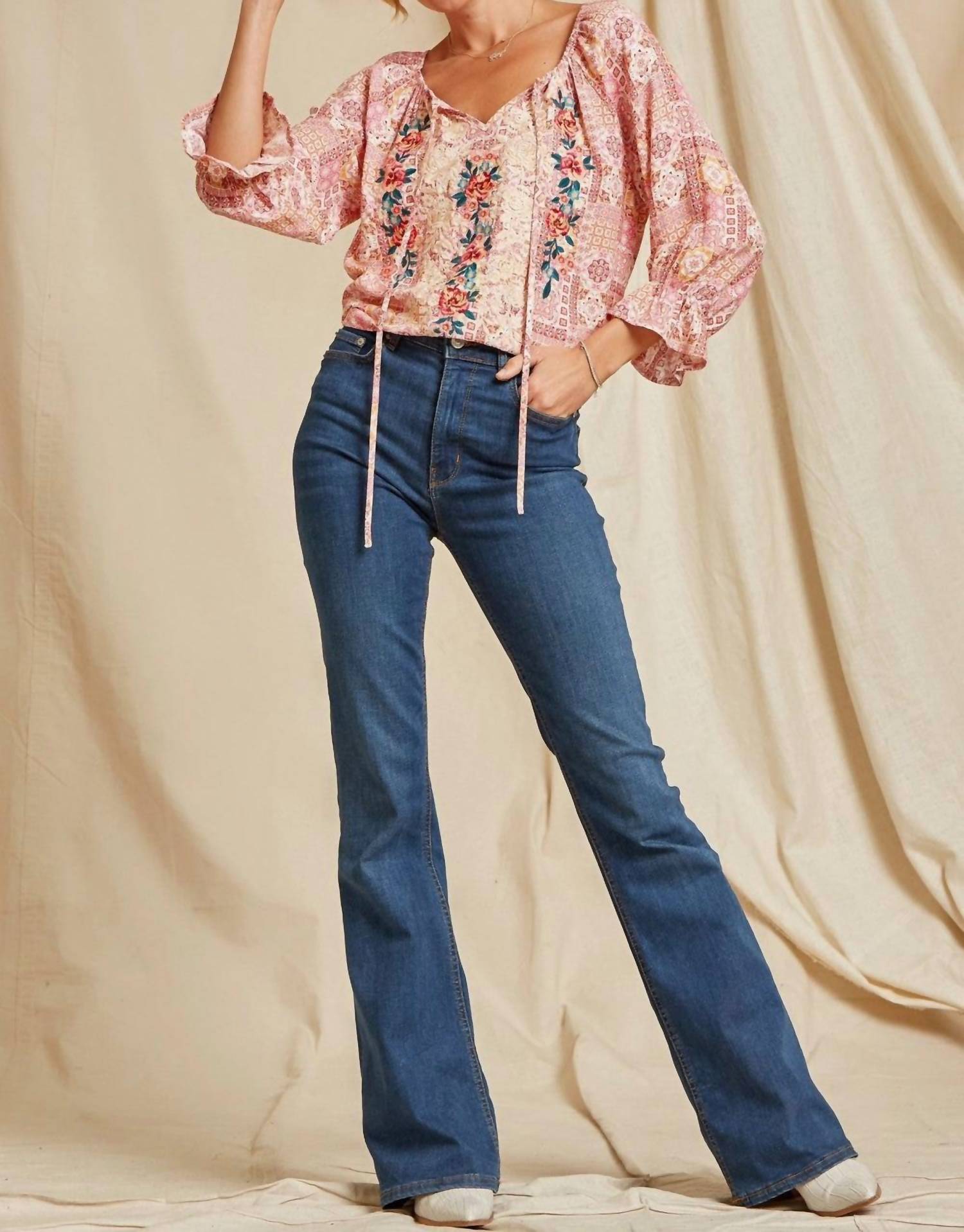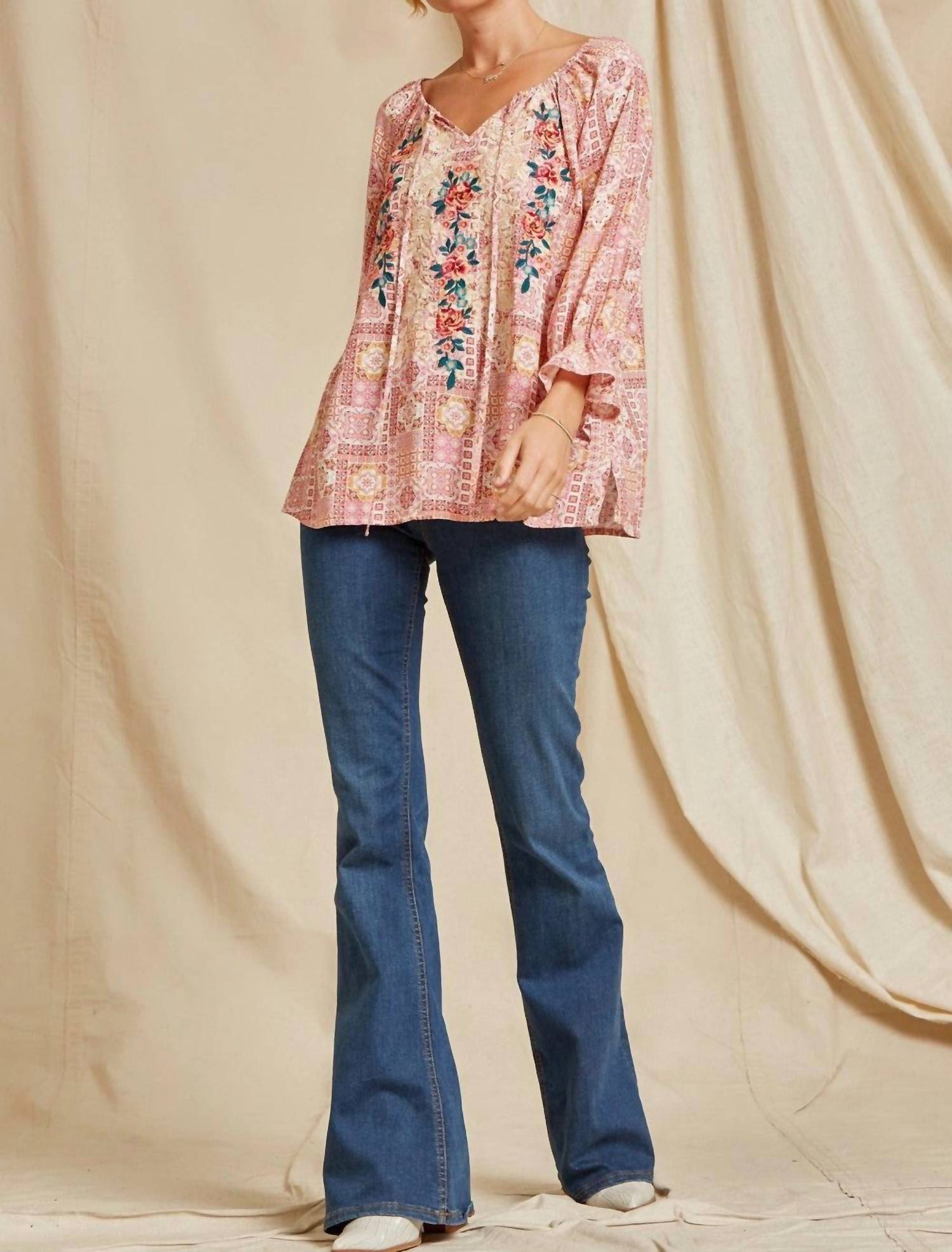A timeless blouse that will never go out of style. Embrace the boho chic trend with the Aztec Embroidered Peasant Top by Andree by Unit, designed in a vibrant multi-patterned print. This blouse features three-quarter sleeves with elastic and ruffle at the wrist, and a relaxed silhouette enhanced by its 27" garment length and side slits. Crafted from 100% rayon, the top offers a non-stretch, fluid drape and an elastic split V-neckline with tie closure, perfect for a carefree yet polished look. For care, simply hand wash cold to maintain its vibrant embroidery and soft texture.
