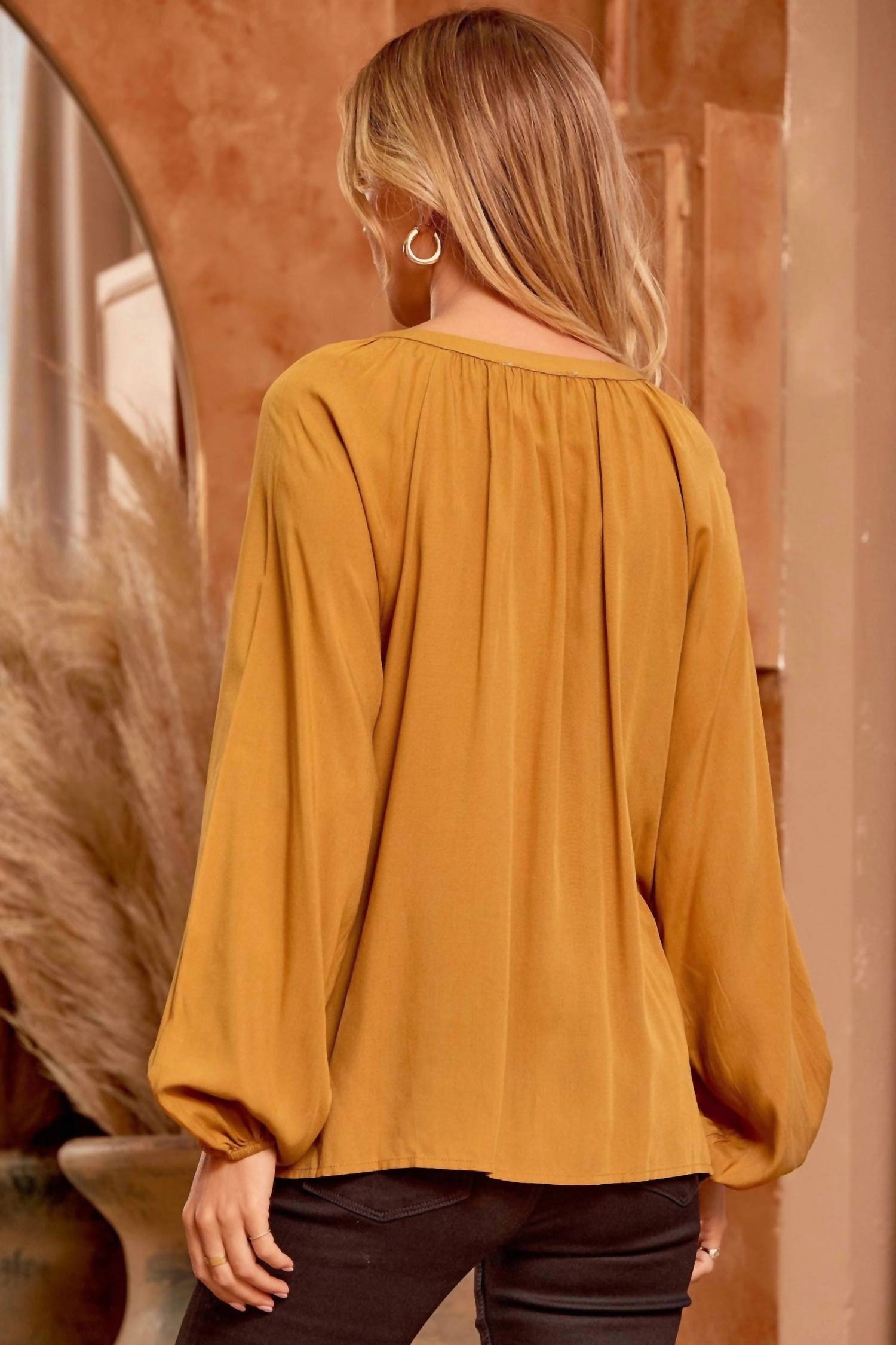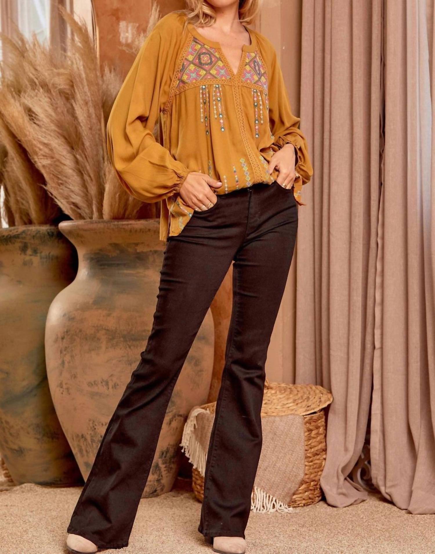 Pair this with your favorite jeans and slides for your next girls night out. Discover the must-have Embroidered Lace Blouse by ANDREE BY UNIT, a remarkable addition to your wardrobe in a vibrant mustard hue. Showcasing long balloon sleeves with elastic wrists, colorful embroidery, and delicate lace detailing, this piece embodies an elegant A-line silhouette. Crafted from 100% woven rayon, this blouse offers no stretch and features a pull-on closure. Care for this patterned beauty with a hand wash in cold water. Available in versatile sizes: Small, Medium, Large, 1X, 2X, and 3X, with lengths ranging from 26" to 29". Ideal for a chic Thanksgiving ensemble or to embrace the Western trend.