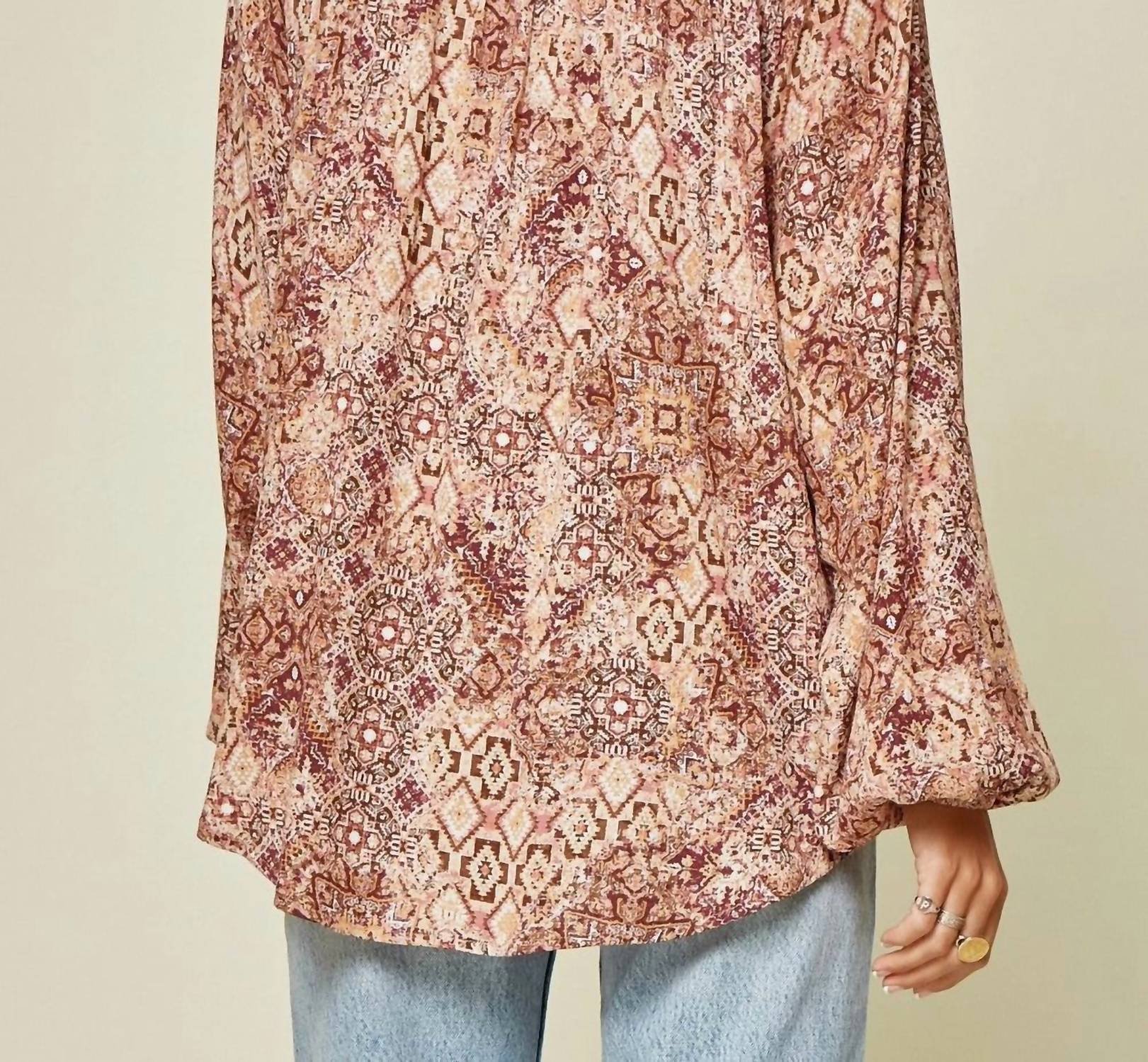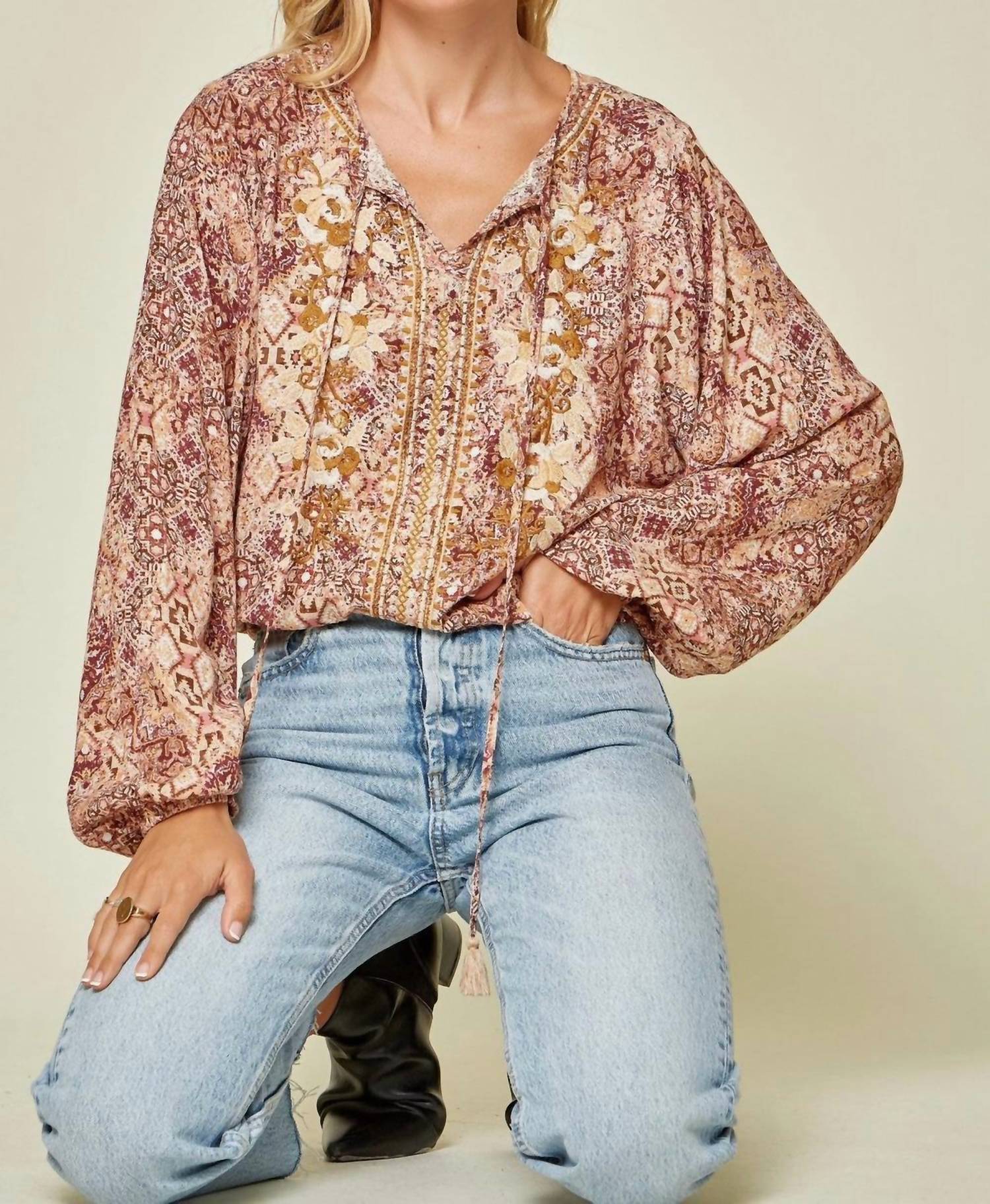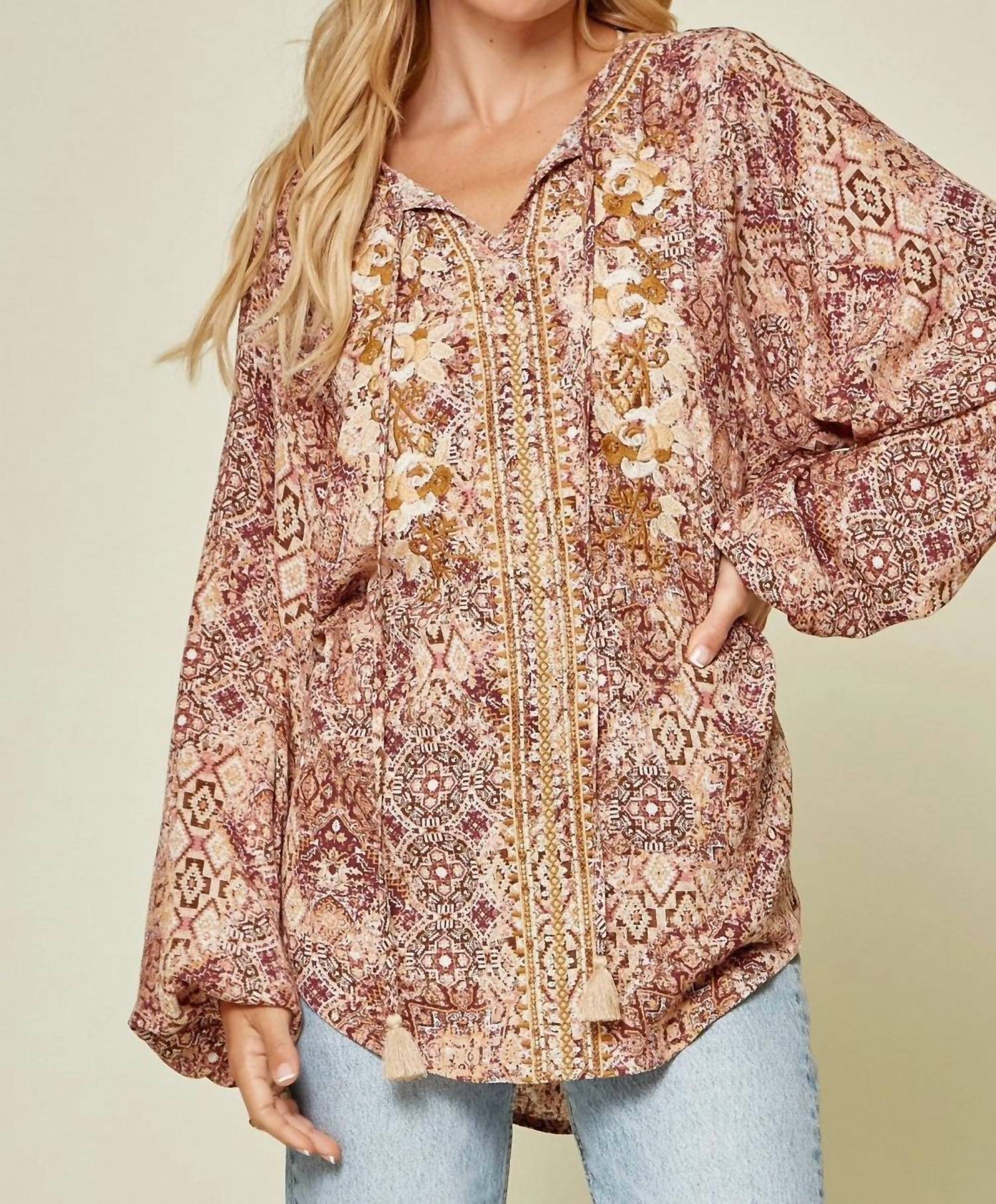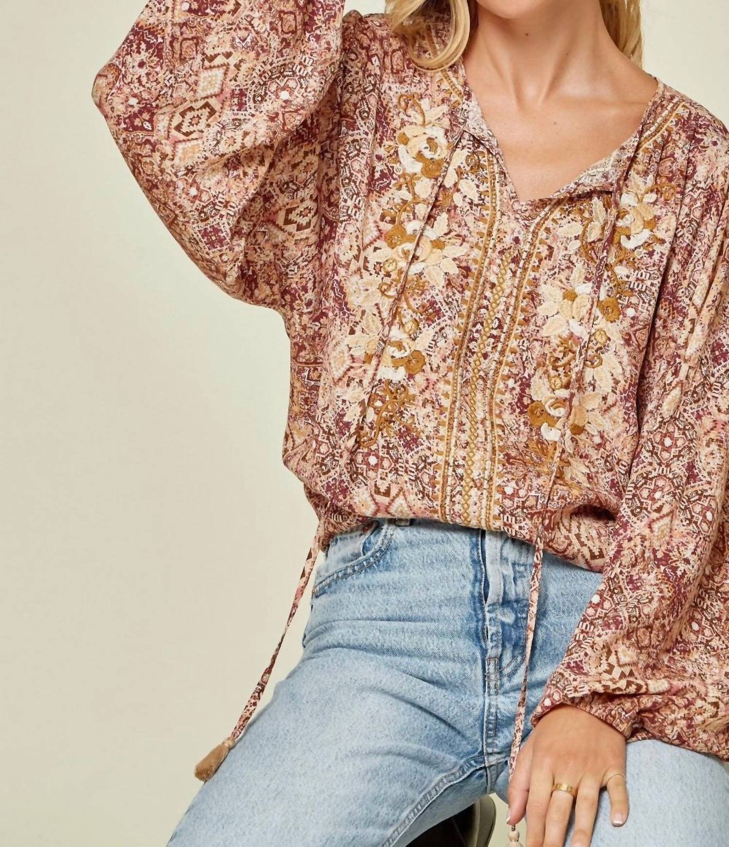 Pair this with your favorite jeans and slides for your next girls night out. Elevate your wardrobe with the Embroidered Peasant Top by ANDREE BY UNIT, a charming blend of boho chic and timeless elegance. This magenta and rust blouse features long sleeves with elastic wrists, offering a comfortable fit through its pull-on closure and relaxed silhouette. Crafted from 100% woven rayon, this top boasts a split V-neckline adorned with tassel ties and tonal embroidery for a whimsical touch. Care: Hand wash cold and line dry.