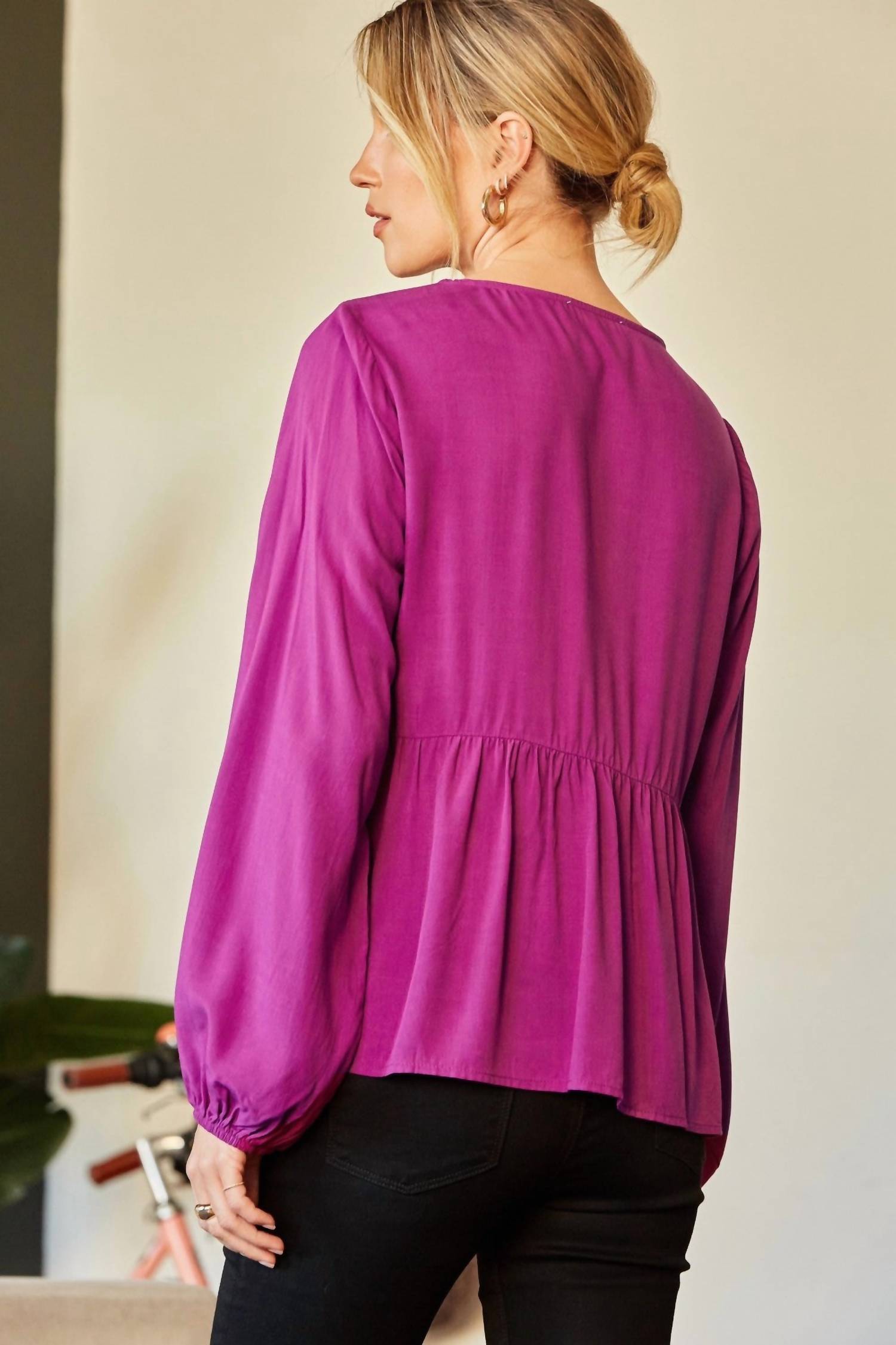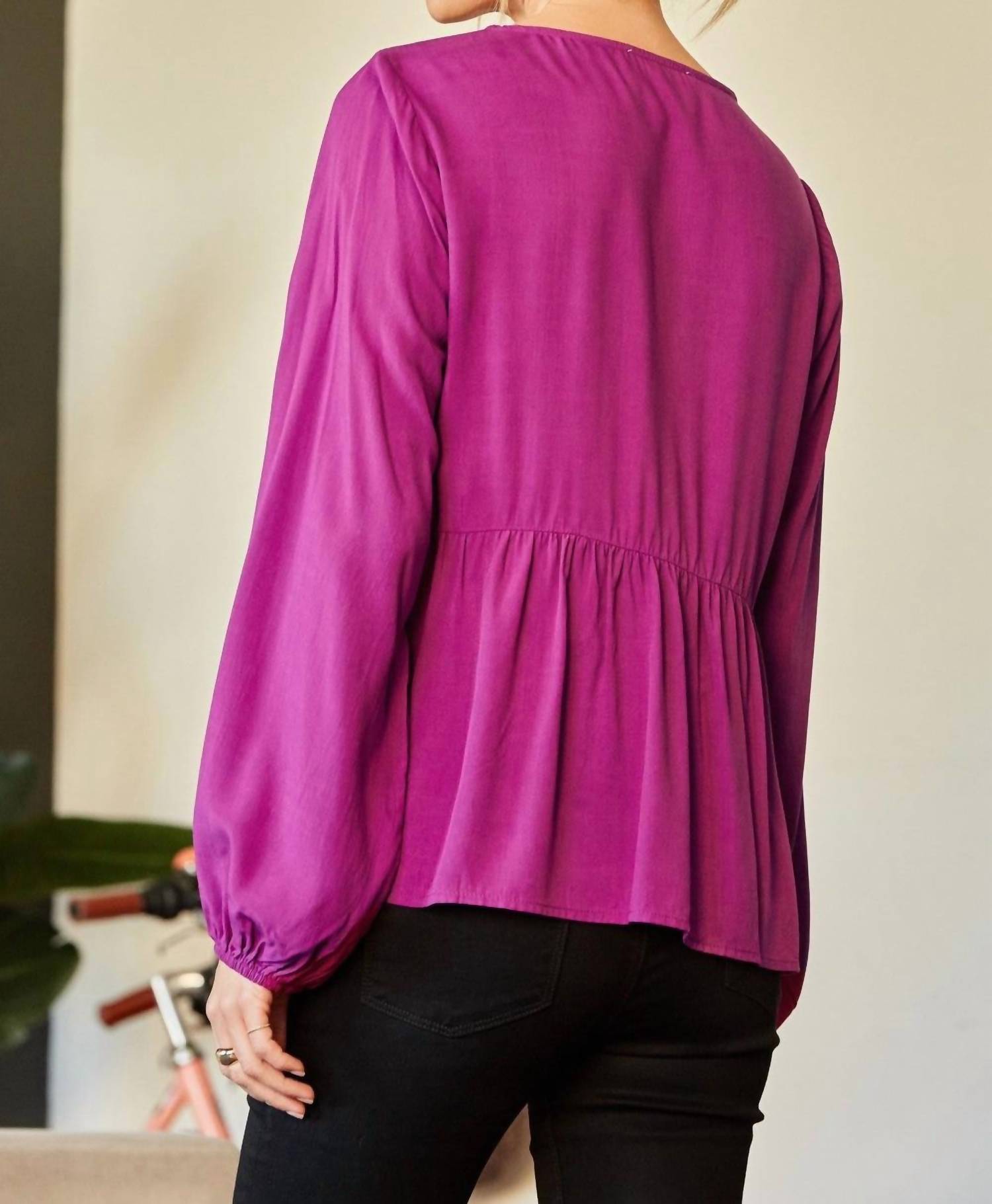 A timeless blouse that will never go out of style. Introducing the Embroidered Peplum Blouse by Andree By Unit, a stunning addition to your wardrobe in vibrant magenta. This boho chic, long sleeve blouse showcases intricate floral embroidery and features a split V-neckline with tassel ties, complemented by elastic cuffs. Crafted from 100% woven rayon, this relaxed a-line silhouette offers peplum styling for a flattering fit. Closure: Pull on. Care: Hand wash cold, line dry.