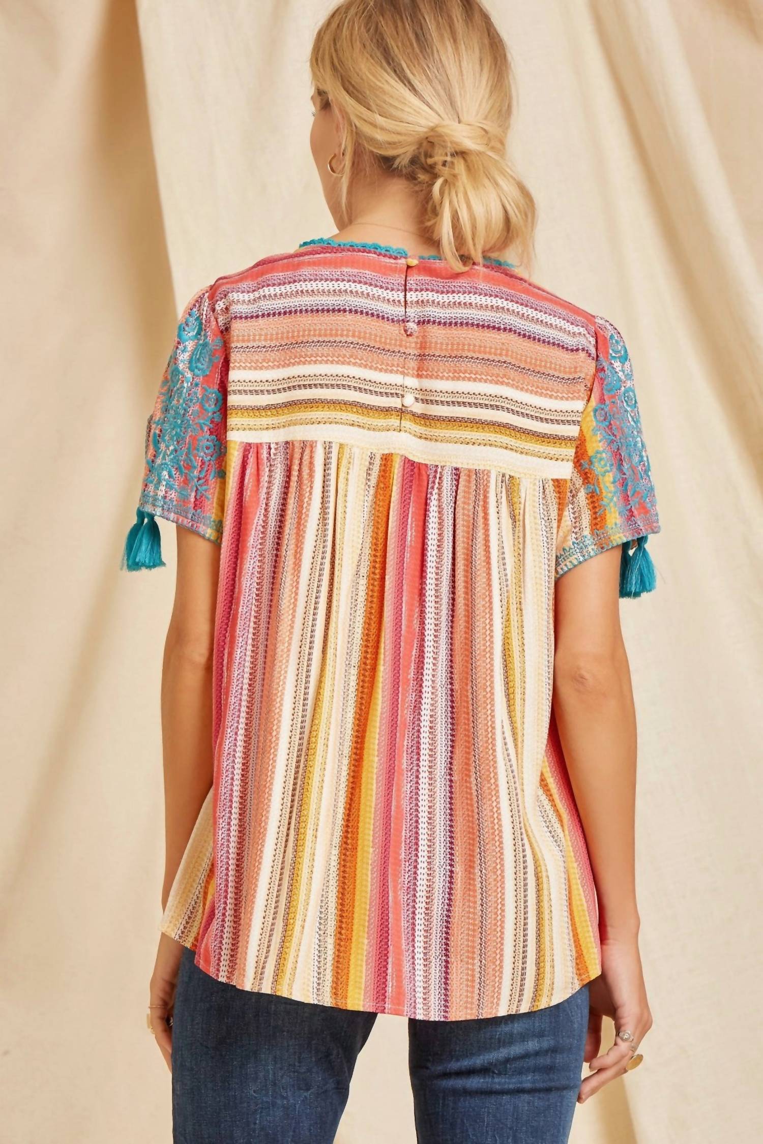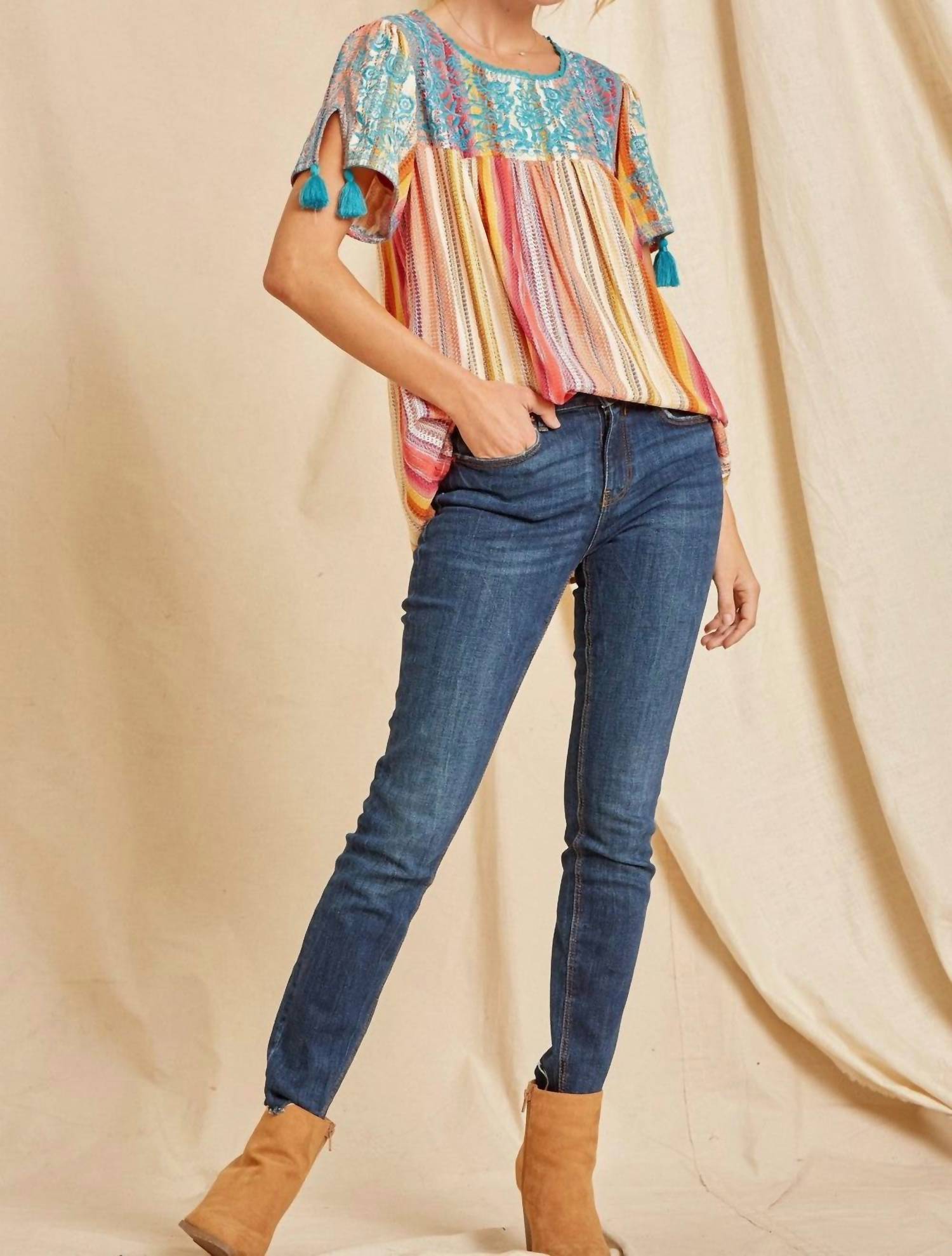 A timeless blouse that will never go out of style. Elevate your ensemble with the Embroidered Serape Babydoll Top by Andree By Unit in a vibrant multi-color stripe. This women's blouse features short sleeves and a crewneck, and it’s crafted from lightweight, 100% rayon fabric with tonal embroidery and tassel detailing for a chic spring look. With a pull-on closure at the back, it offers a relaxed A-line fit that pairs effortlessly with skinny jeans. Available in bust sizes from 38" to 52" and a length of 26" to 27", it's ideal for seasonal occasions and requires hand washing and line drying to maintain its texture.
